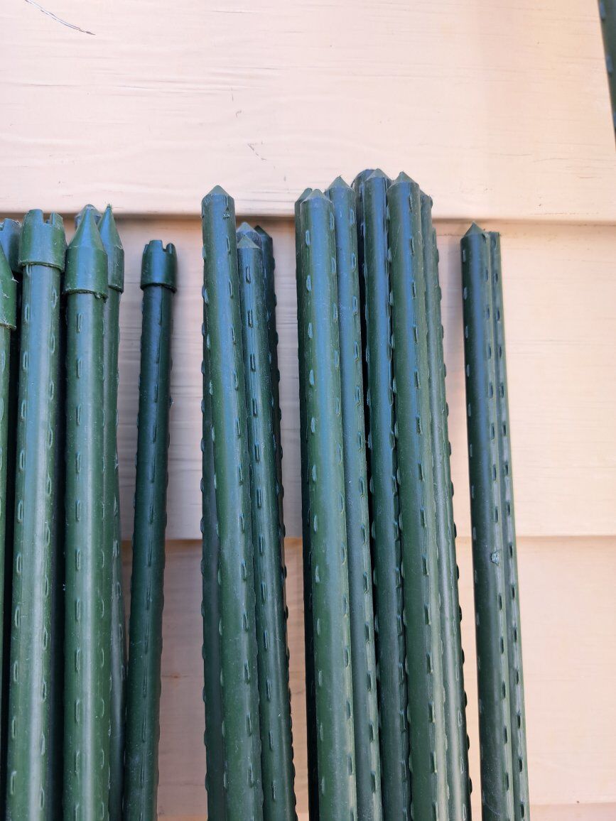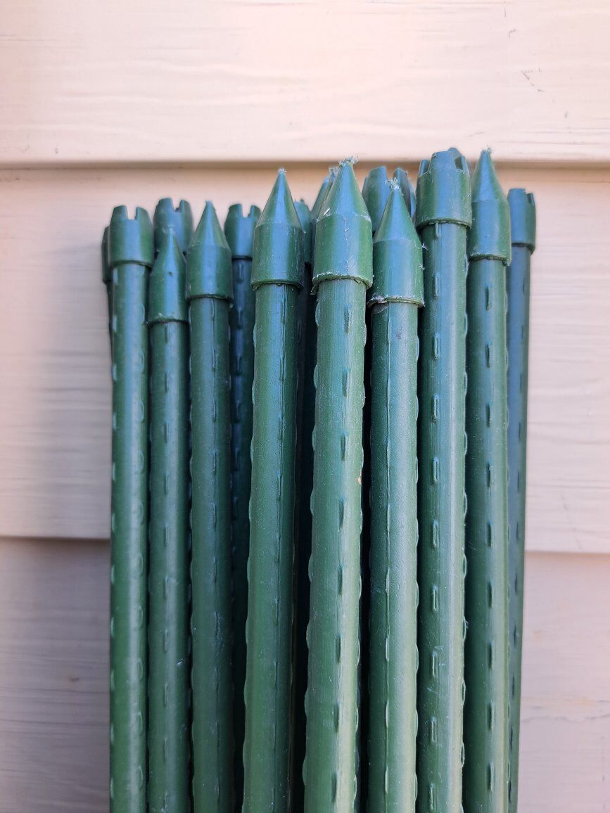 Venmosturdy steel garden stakes plastic coated plant stakes for climbing plants 7/16" diameter 4' 4' ft 100 pcs $100 6' ft 20 pcs 30 7' ft 24 pcs $50 8' ft 3/8" diameter fiberglass 20 pack dark green Ecostake $65