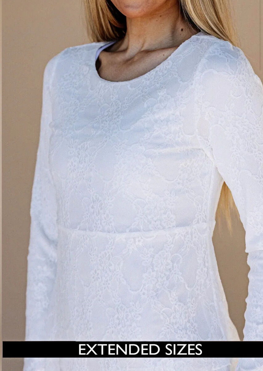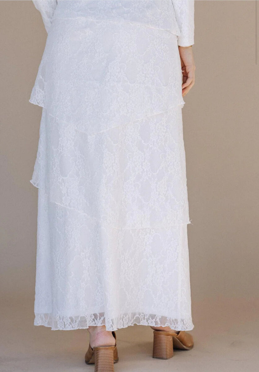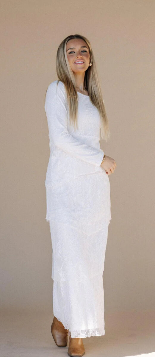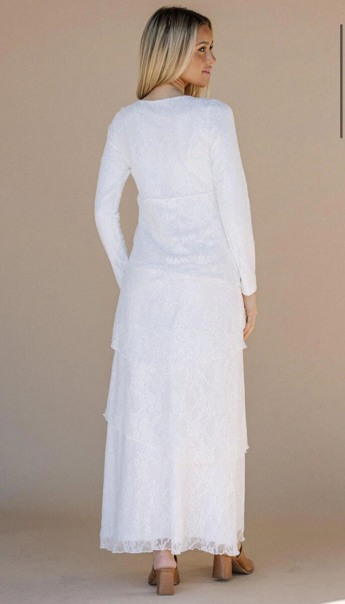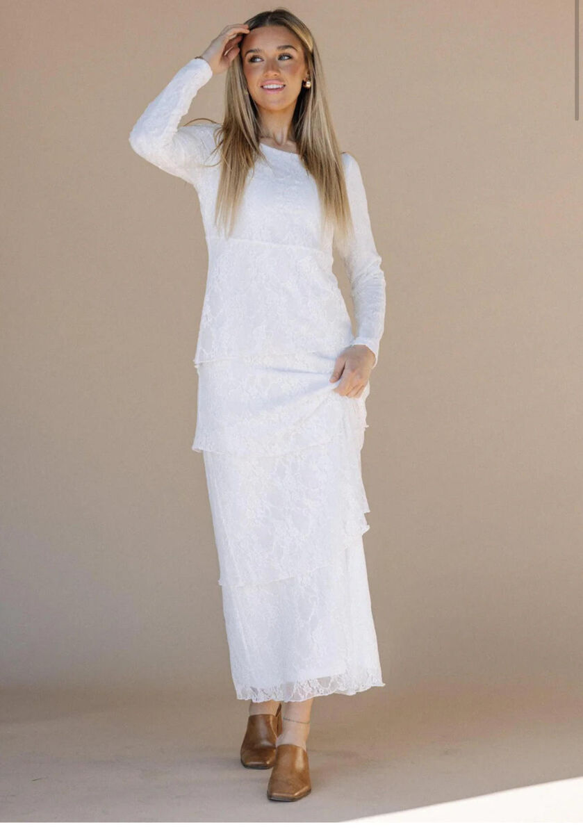 ApplePayIntroducing the Brielle LDS Temple Dress - This dress features a layered skirt and delicate lace details, creating a beautifully flowing silhouette with a maxi length and round neck. The fitted design adds a touch of femininity to this luxurious piece. Hidden hip pockets included.