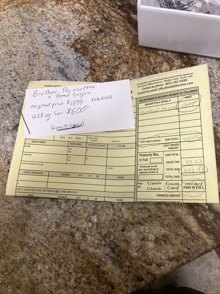VenmoWell maintained serger. Low mileage. Was used for about 6 months before it was stored. Original price $1399.00 Asking $500 OBO