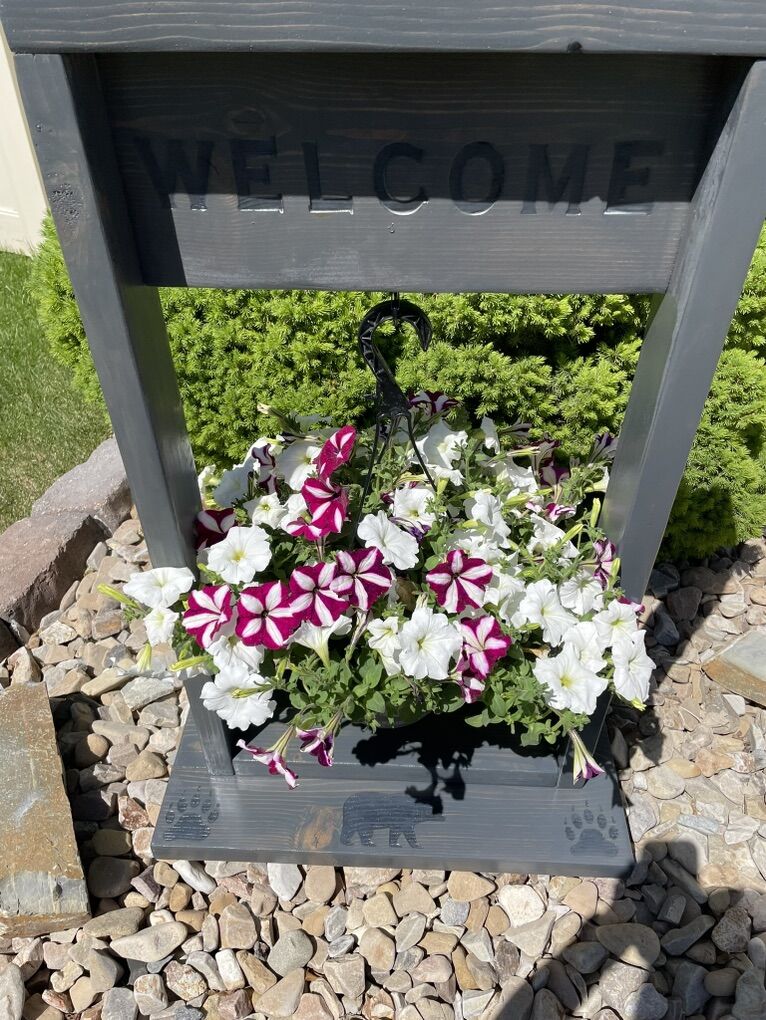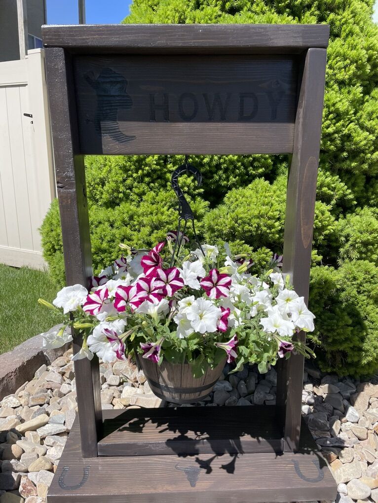 ApplePayCustom made Welcome and Howdy flower pot or wreath hangers. Coated and sealed for the outdoor elements or put indoors with a decorative wreath Flower basket and wreath not included.