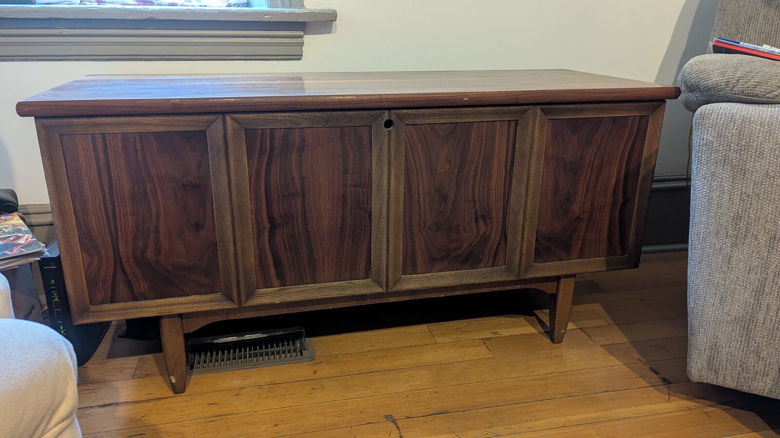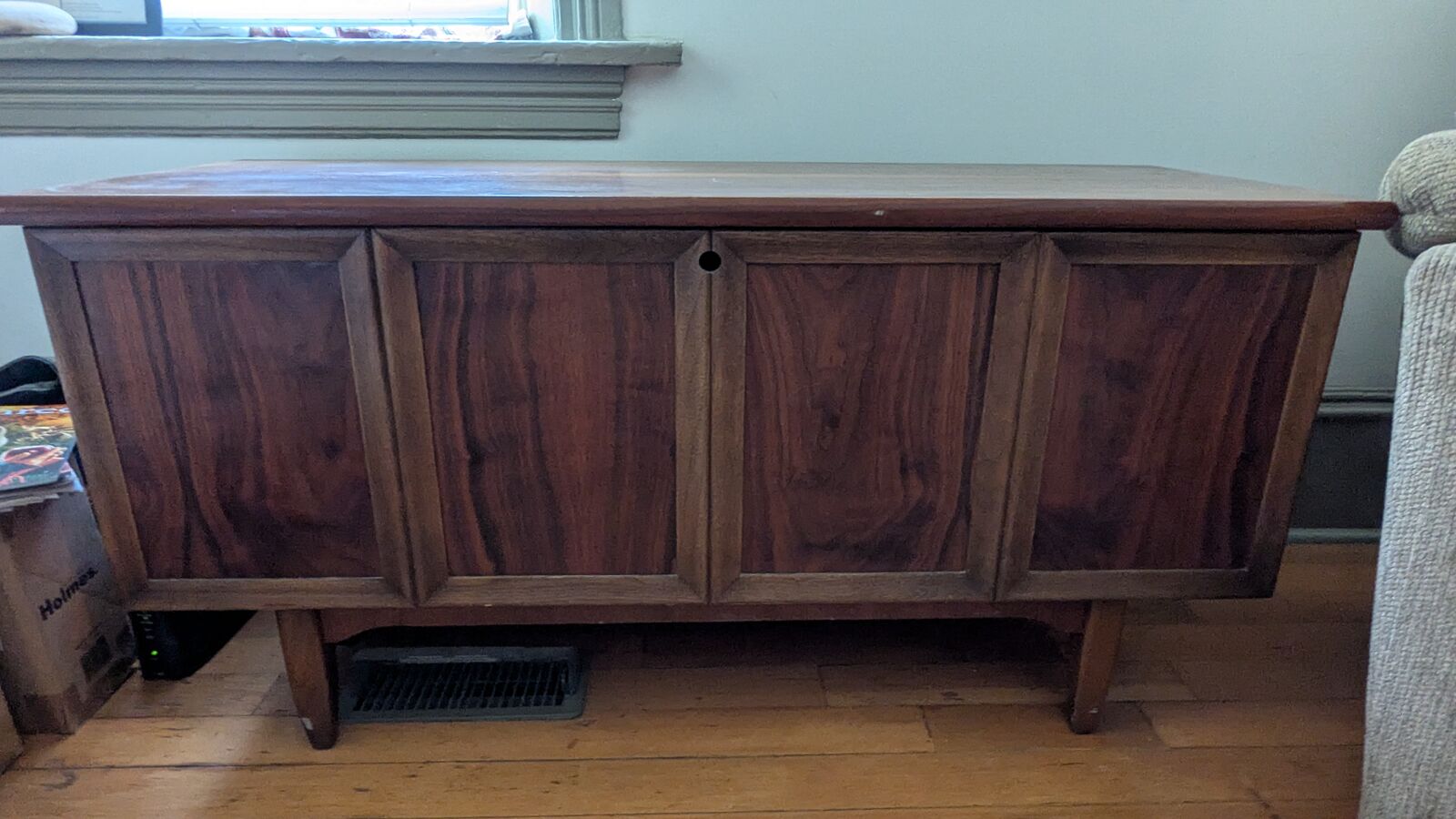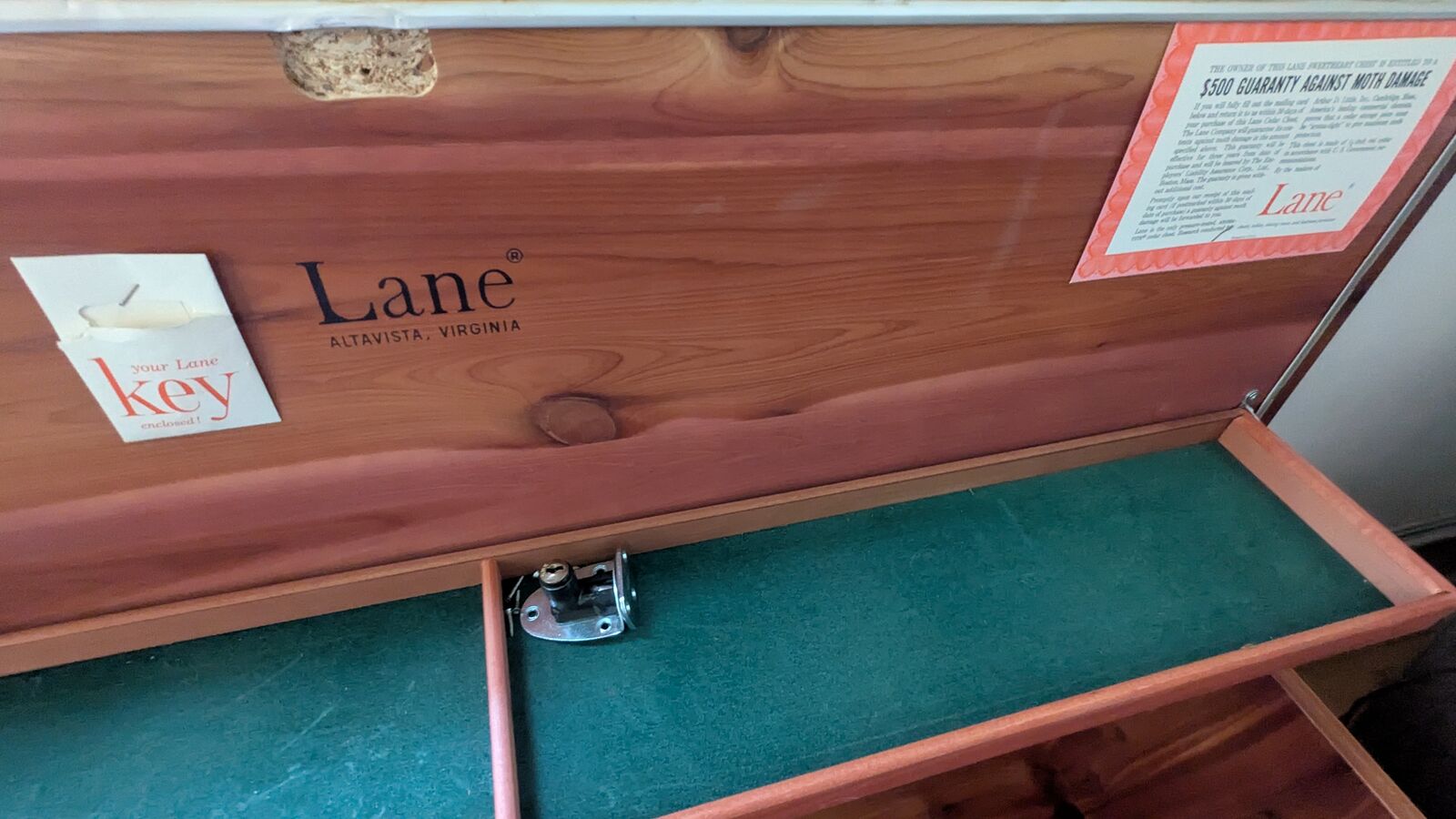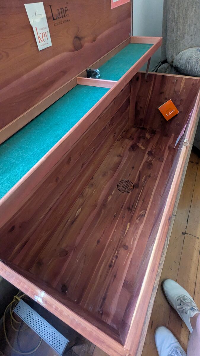 VenmoWe are selling our Lane Sweetheart series cedar chest purchased in 1964. It has stayed in the family though we no longer have room for it. This is a heavy and well made piece of furniture. The cedar interior, legs, and exterior are clean and in good condition. The piece has Lane hardware, all original hinges, and the safety lock has been removed and is shown/included. The upper interior shelf still has the original green velvet.