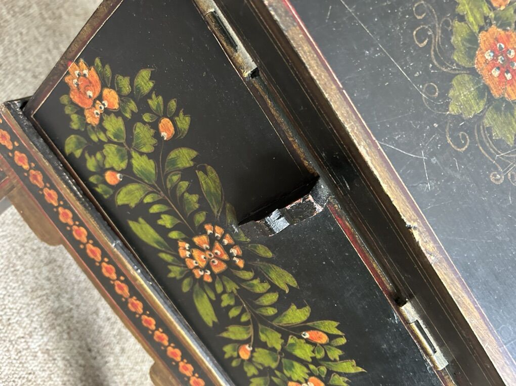 Not sure of the exact history on this piece, but judging by the hinges and clasp, it seems pretty old. Could be mid-late 19th or early 20th century. Solid construction.
