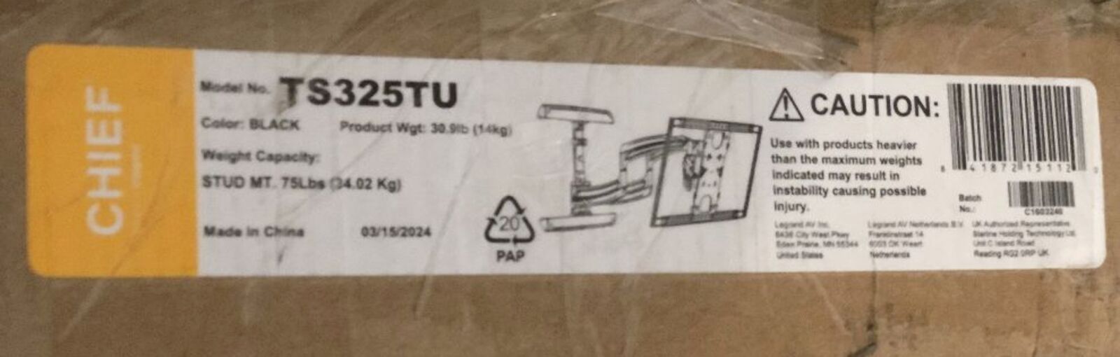 The Chief TS325TU THINSTALL Dual Swing-Arm Wall Mount is a suitable way to achieve flexible viewing options for displays measuring from 26 to 52" and weighing up to 75 lb. This mount extends from 1.3" to 25" from the wall and offers a downward tilt up to 15° and a pivot adjustment up to ±90°, depending on the display's width. Post-installation, you can further adjust the display's lateral position up to 16" and height up to 1" for your preferred screen placement. The mount maintains a clutter-free look via tool-free cable covers and an open wall plate design, which tucks in loose wires for a seamless installation.