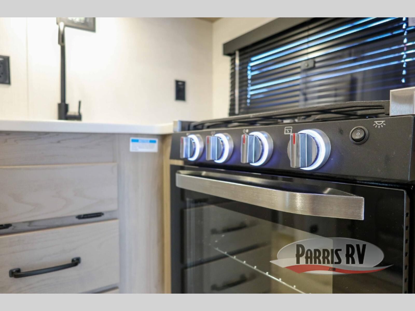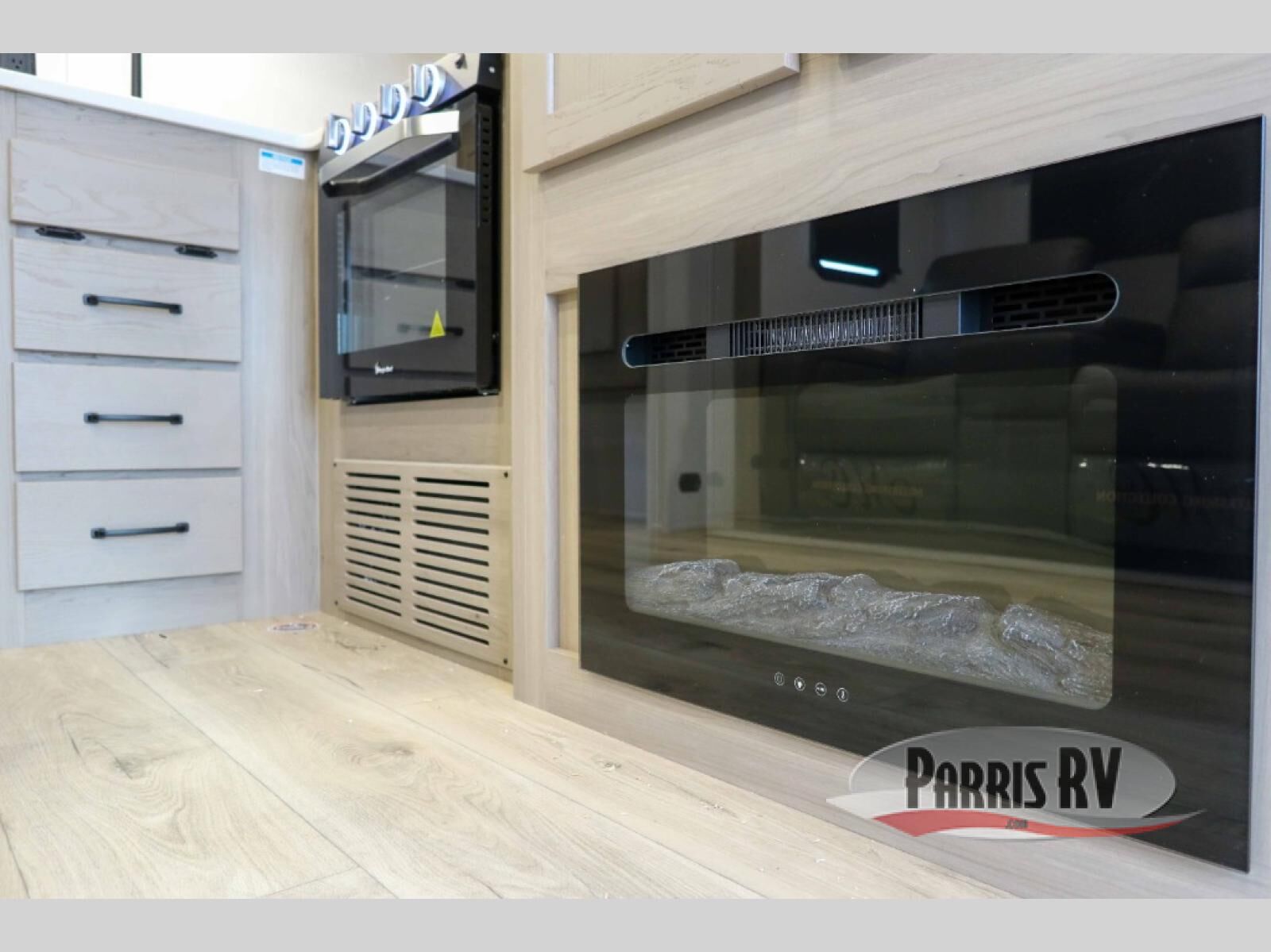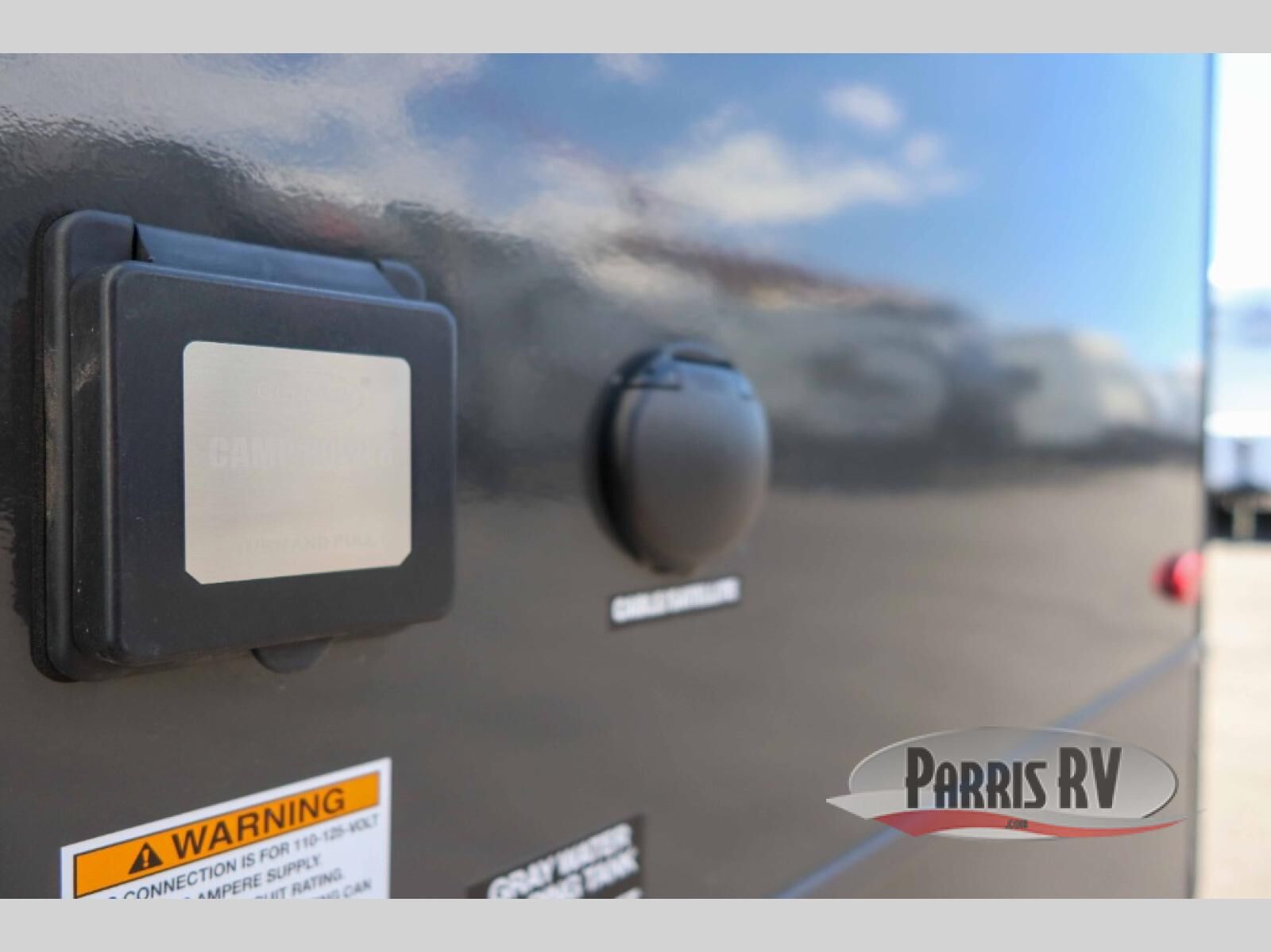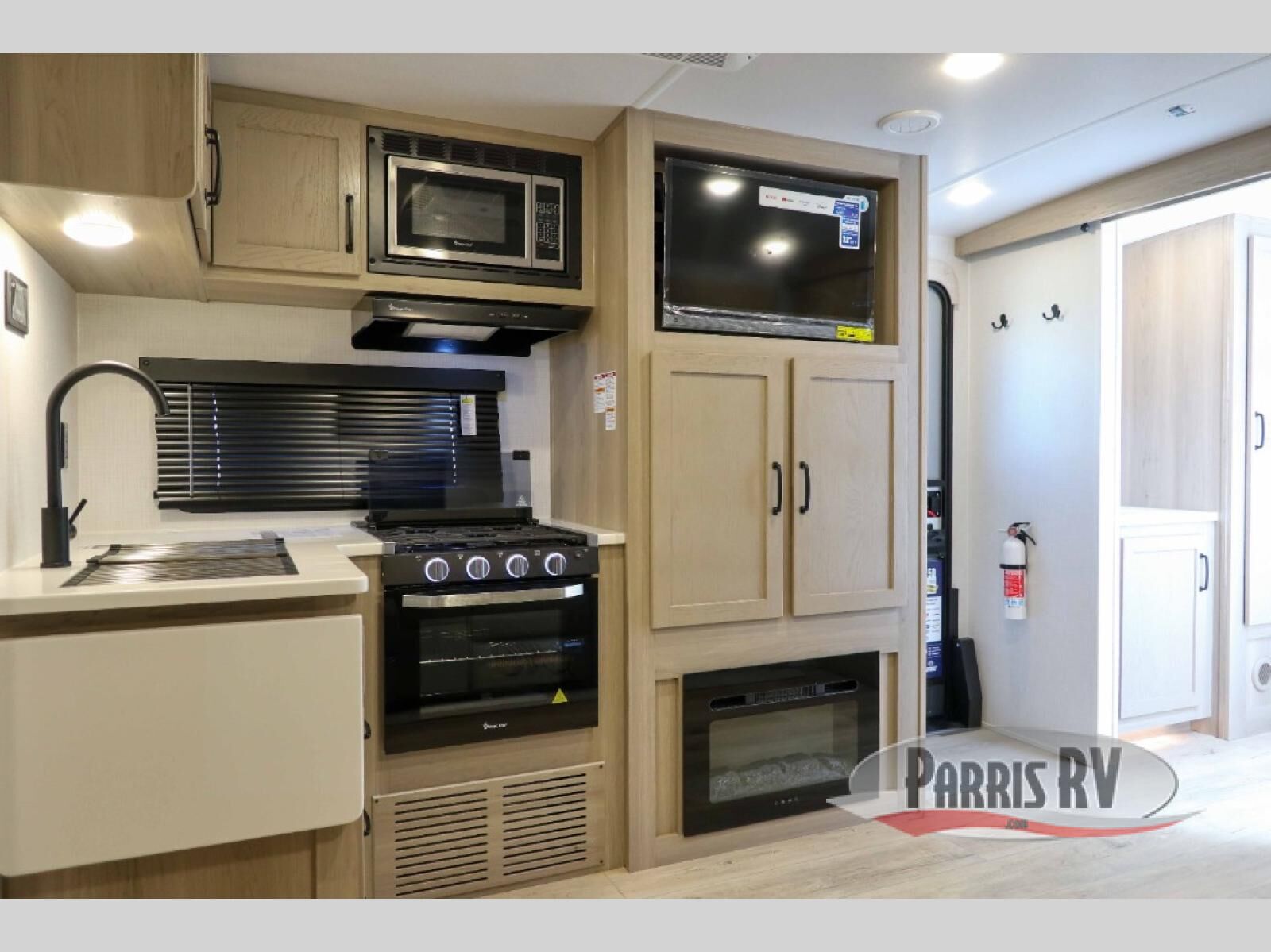 Camping trips to the lake just got sweeter with this dual slide out travel trailer in tow! Once you arrive, unload your gear from the exterior drop-frame pass-through storage, then start lunch on the exterior griddle. If you need a rest after traveling all day, the RV queen bed in the front bedroom is sure to give you comfort, or you can relax on the theater seating. The fireplace and entertainment center with a 32" TV will make this space feel just like home, and check out the spacious full rear bath for added privacy. This model also includes an entryway closet/pantry for jackets, shoes, and food!