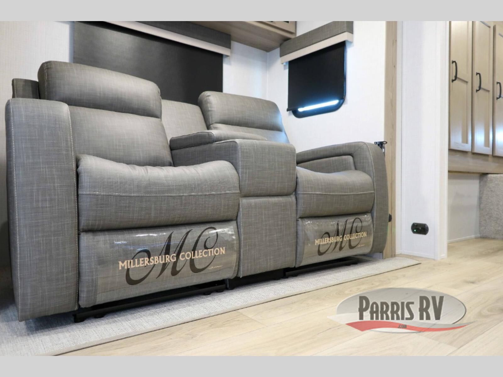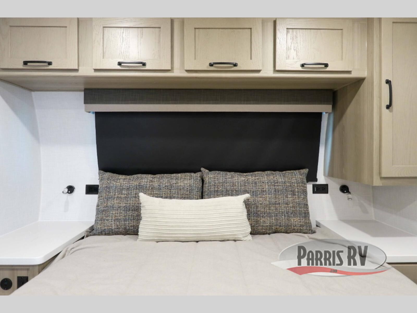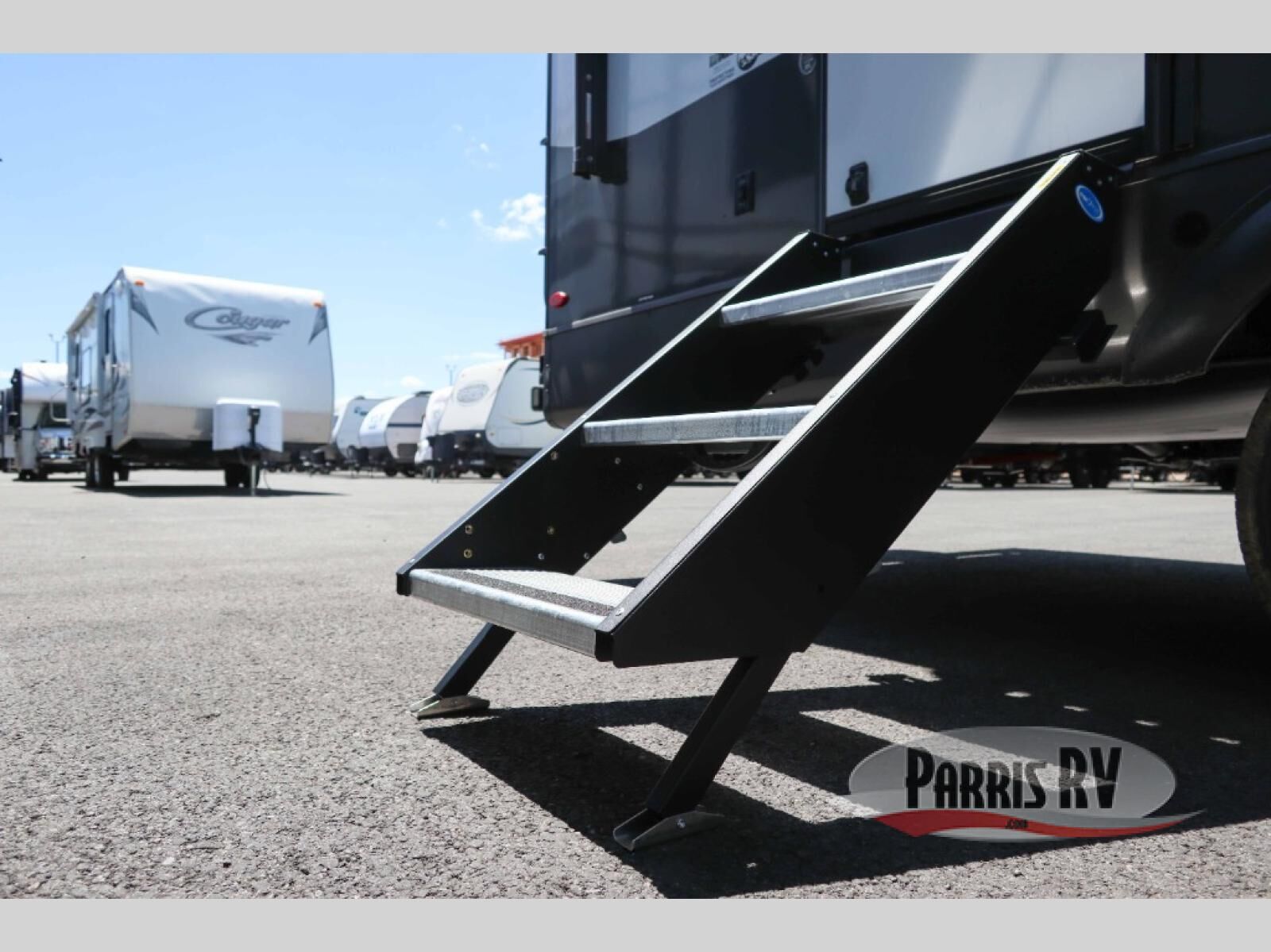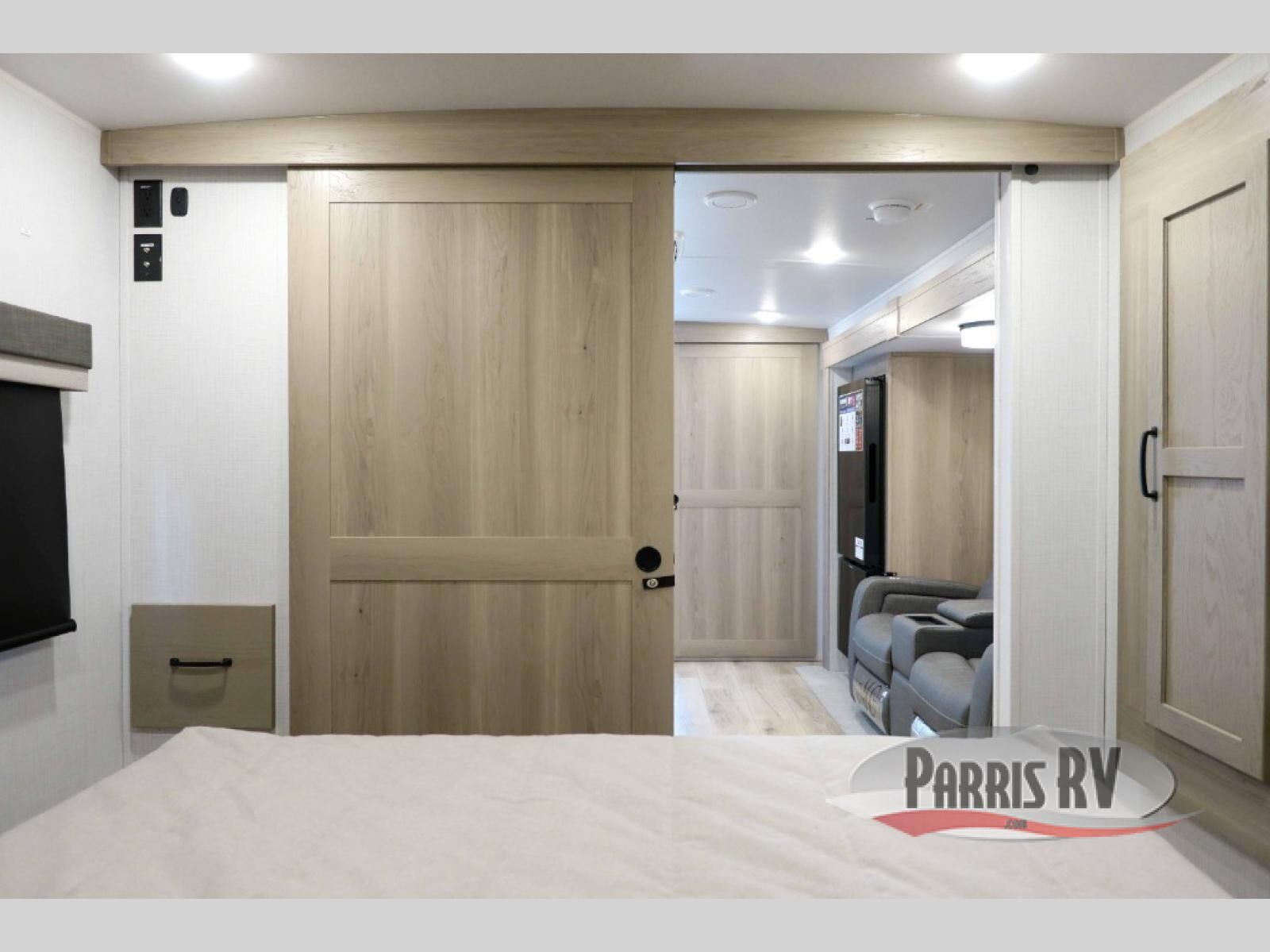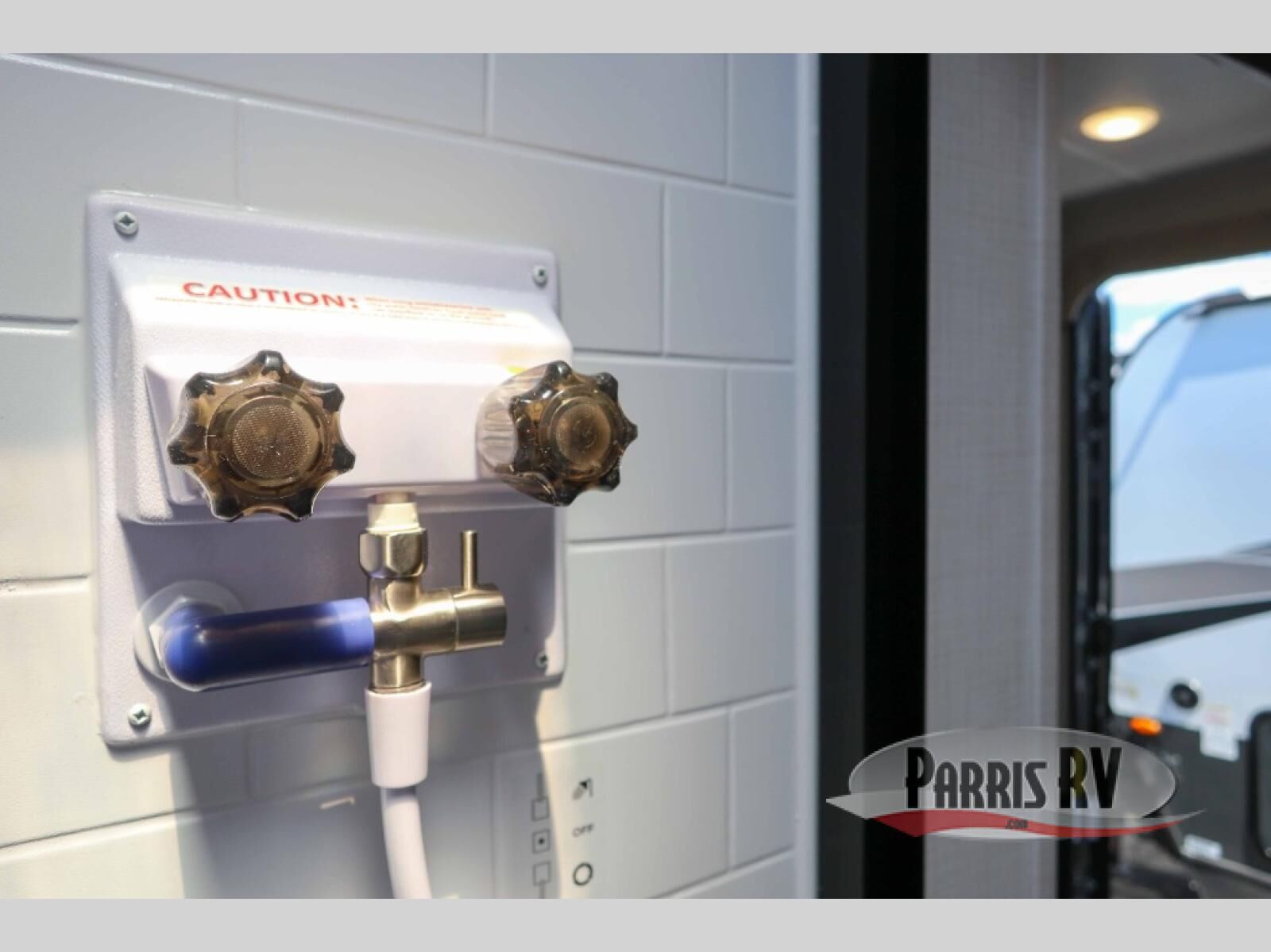Camping trips to the lake just got sweeter with this dual slide out travel trailer in tow! Once you arrive, unload your gear from the exterior drop-frame pass-through storage, then start lunch on the exterior griddle. If you need a rest after traveling all day, the RV queen bed in the front bedroom is sure to give you comfort, or you can relax on the theater seating. The fireplace and entertainment center with a 32" TV will make this space feel just like home, and check out the spacious full rear bath for added privacy. This model also includes an entryway closet/pantry for jackets, shoes, and food!