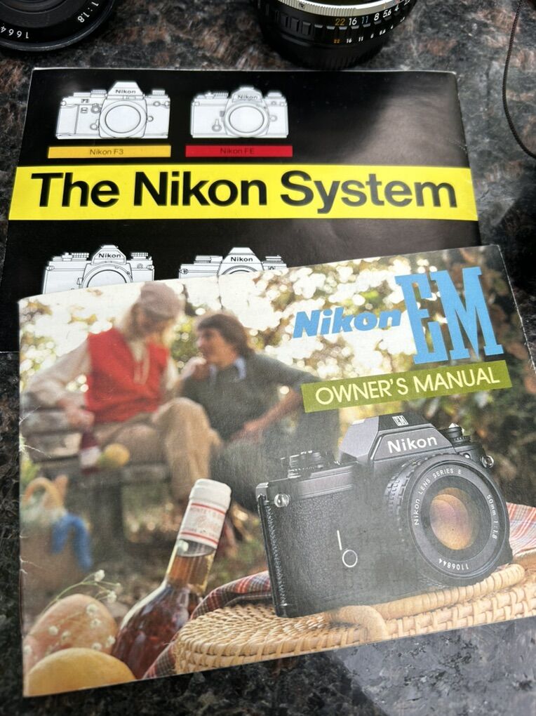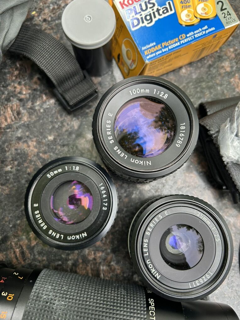 Set includes: •Nikon EM film camera •35mm 1:2.5 lens •50mm 1:1.8 lens •100mm 1:2.8 lens •Promaster Spectrum 7 Mc Auto Zoom lens •Promatic FT1700 flash •52mm Hoya lens filters x3 (+1, +2, +4) •2 Rolls Kodak 400 film •1 Roll Kodak Elite 100 slide film •LowePro Elite Convertible camera bag (with shoulder and waist straps) •Vintage Mickey Mouse camera strap •Protective leather camera housing •Original Nikon camera owner manual and system brochure.
