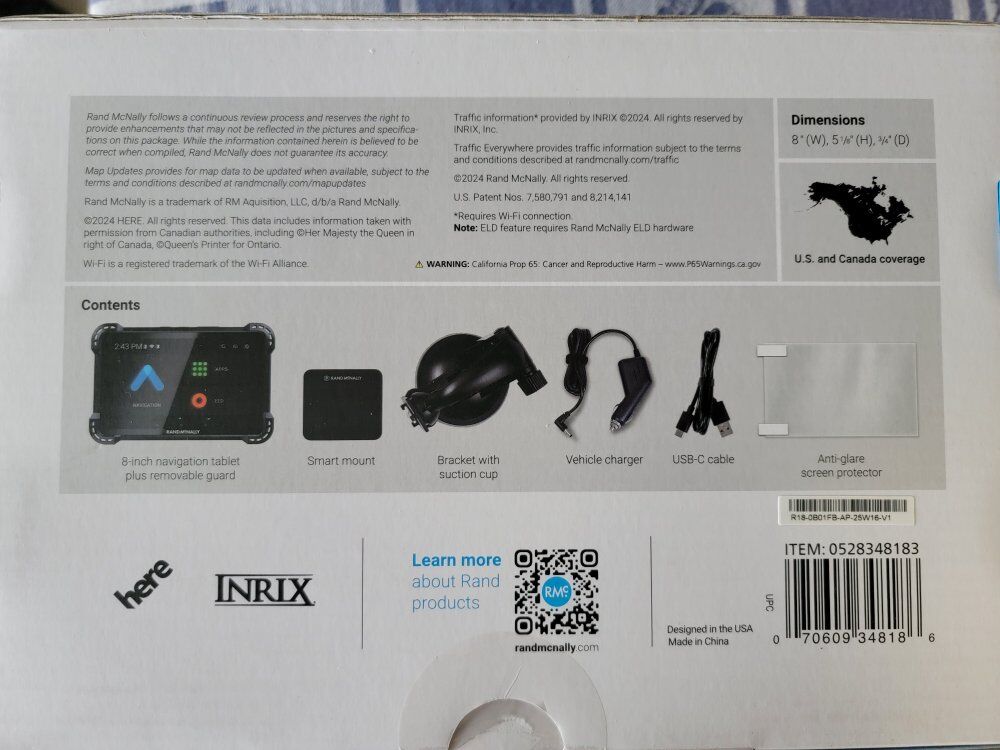 New in the box - 8 inch navigation tablet with removable guard, smart mount, bracket with suction cup, vehicle charger and USB C cable
