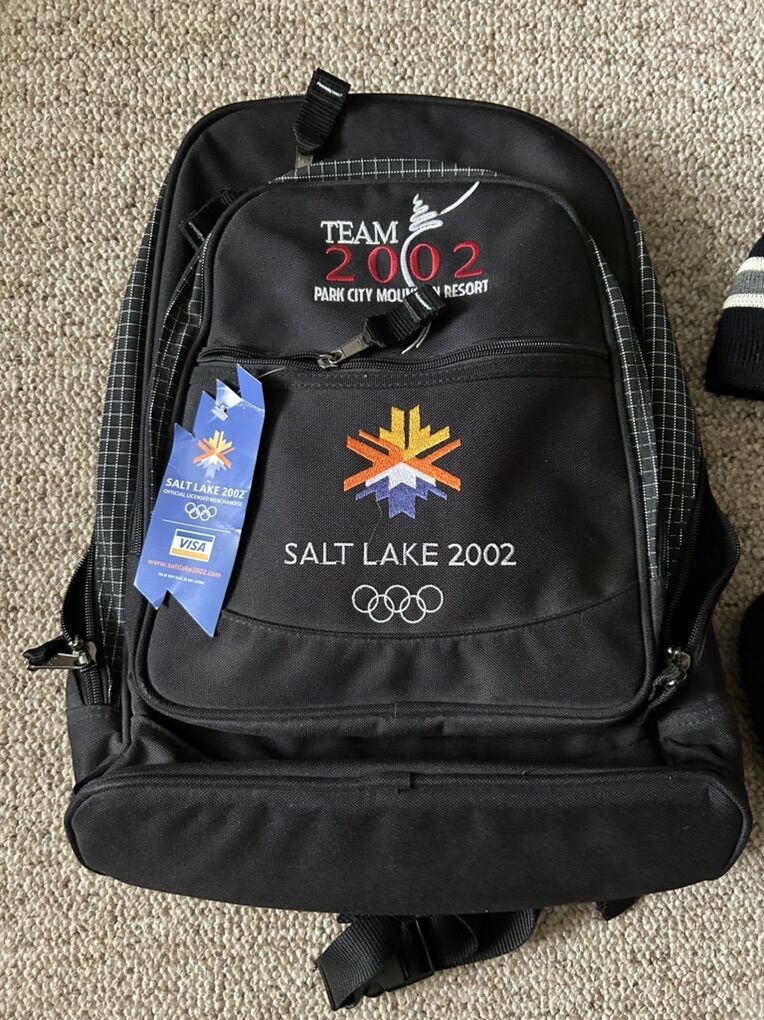 Set includes: •3-pocket Team 2002 PCMR backpack with waist strap and internal laptop sleeve (new with tag). Embroidered Olympic and PCMR logos on front panel. •Microfleece lined beanie with embroidered PCMR Team 2002 logo •Corduroy cap with adjustable strap and embroidered venue info and 2002 Olympic logos