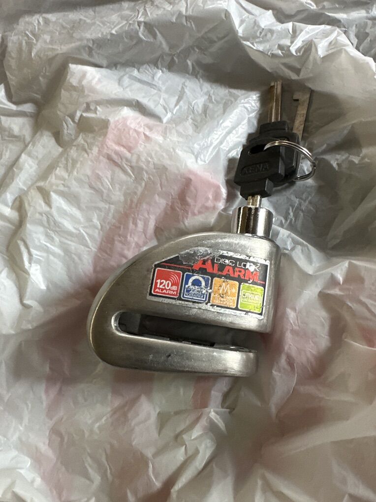 Xena motorcycle alarm. Insert into metal area like front brake disc. Set alarm with the key and it’s set. If someone tries to move your bike it sounds off a high pitch alarm. New battery works great.