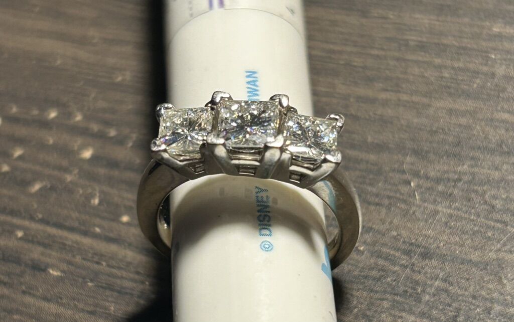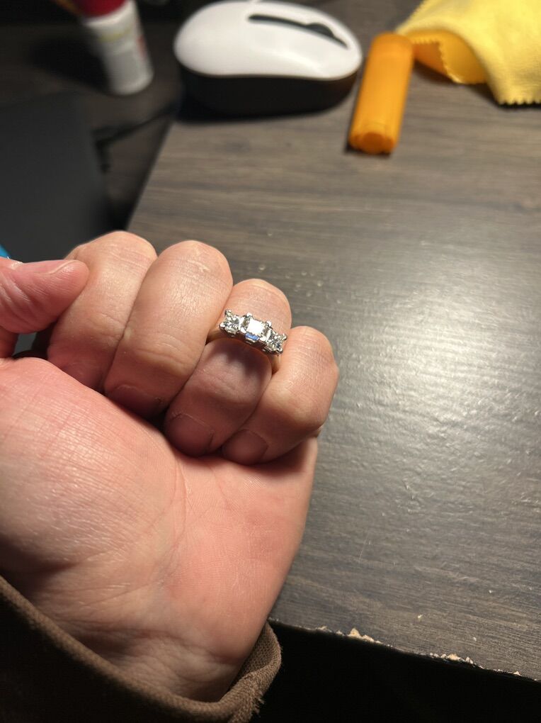 Venmo3 stone moissanite ring size 6 3 carrot total weight. Hasn’t been worn much. Wife doesn’t like it because they’re not real diamonds it’s been sitting in the jewelry box for years now. Paid $730 looking for best offer . Text any questions thanks for looking