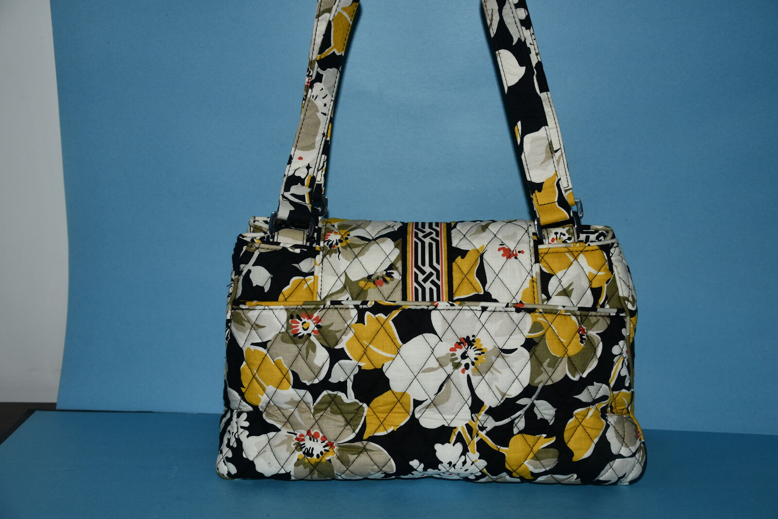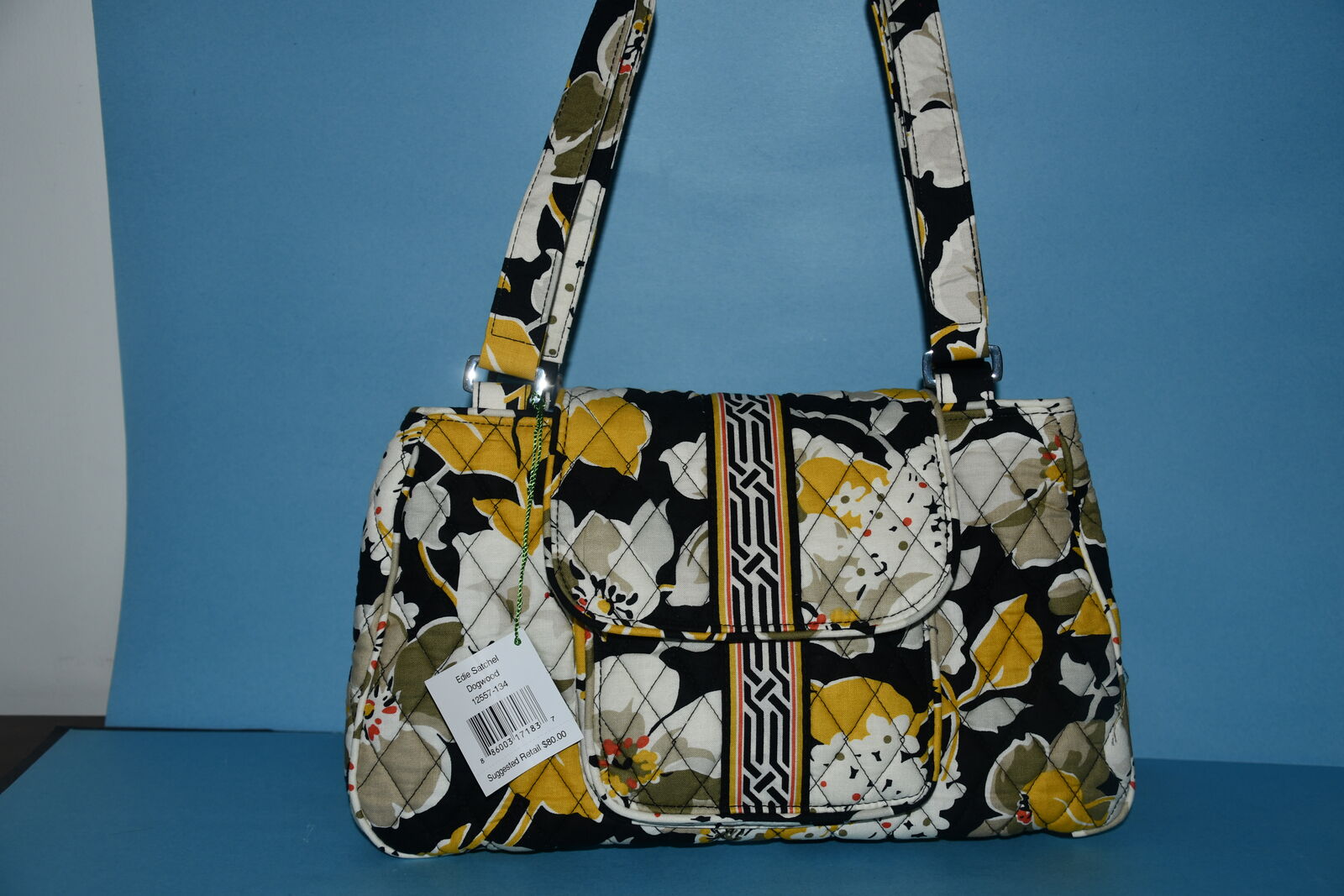 This NWT ($80) VERAL BRADLEY SATCHEL HANDBAG is about 13" x 8" x 4.5". It has a back compartment with a magnetic closure. The front flap has a magnetic closure that opens to an open pocket and 3 compartments. There is also 2 open pockets & a zippered compartment. The handle drop is about 11". Our home is smoke free. Questions??? Please ask. We are located in Plain City. Cash only please.
