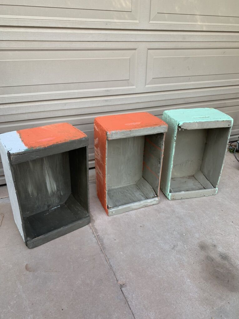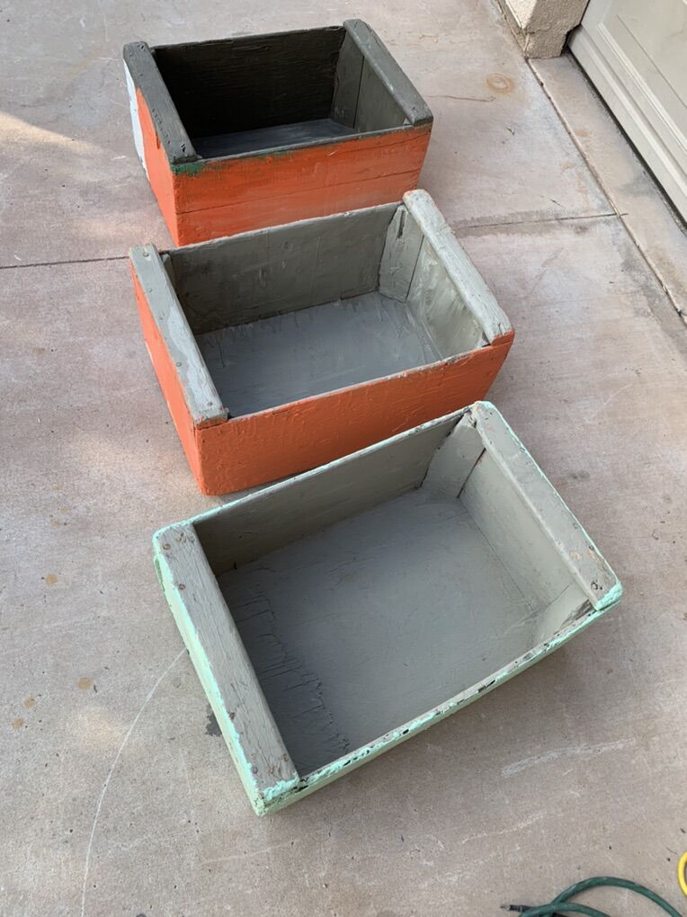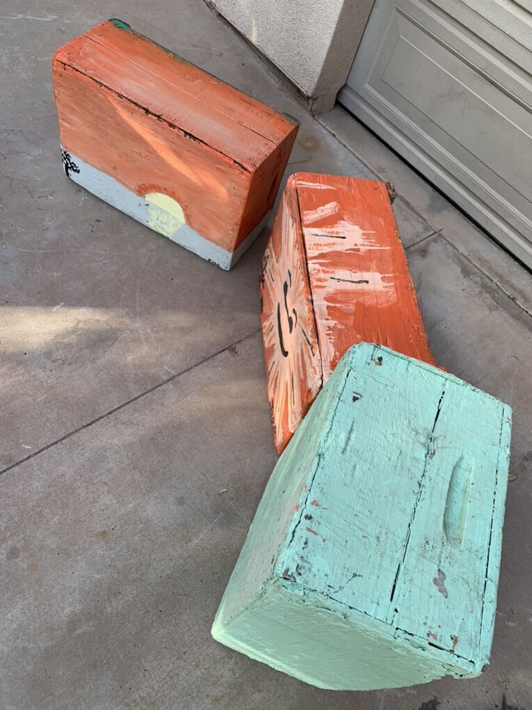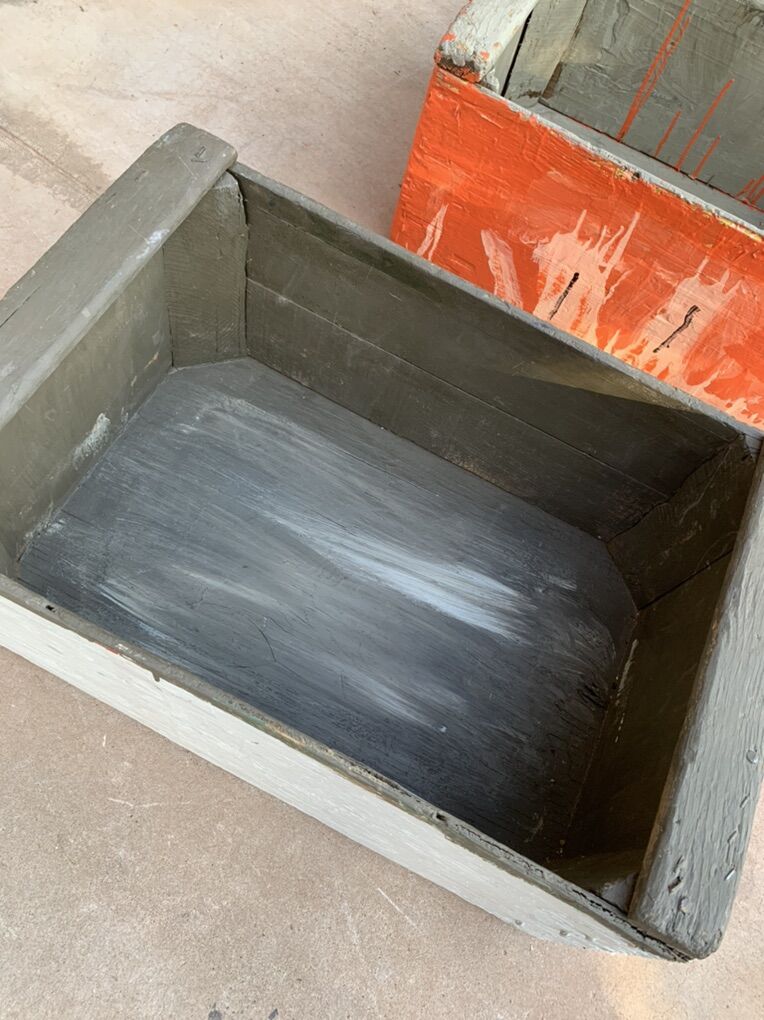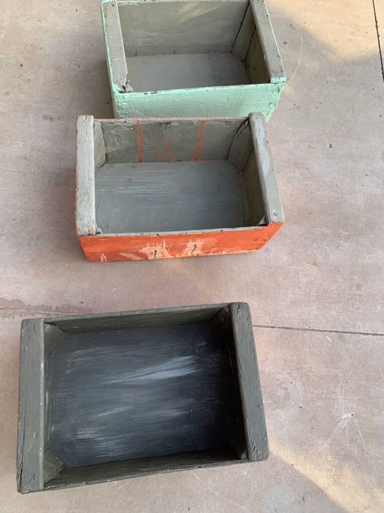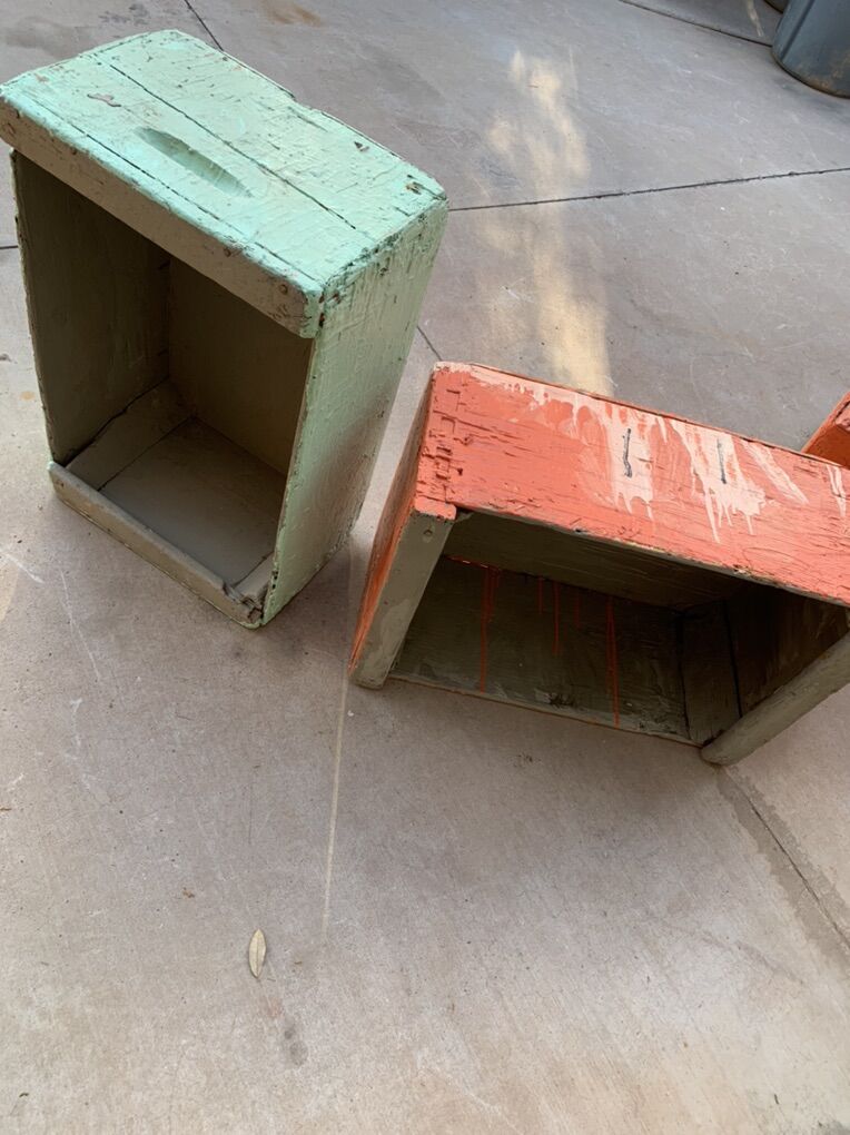 ApplePayAntique heavy duty wooden lug boxes or crates. Used for transporting fruit many years ago, great for tools or toys now. Measures 23 L x 15 W x 10 H My kids painted them, let your kids paint their favorite designs to personalize them.