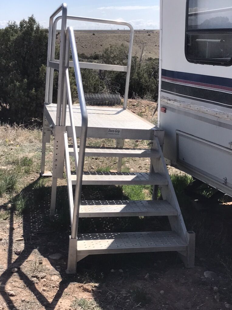 Dura grip brand heavy duty aluminum stairs and landing. Adjustable height from 18 inches to 36 inches. Stairs and railings can be switched and put on either side. Very nice set. Possible delivery. Make me an offer.