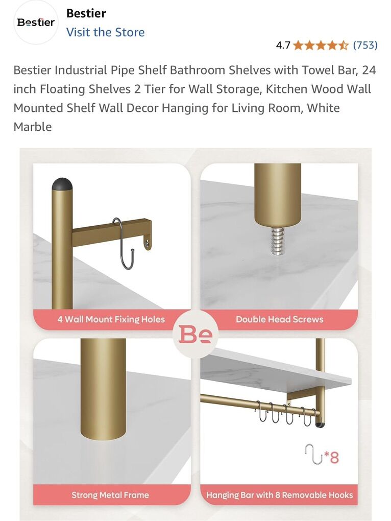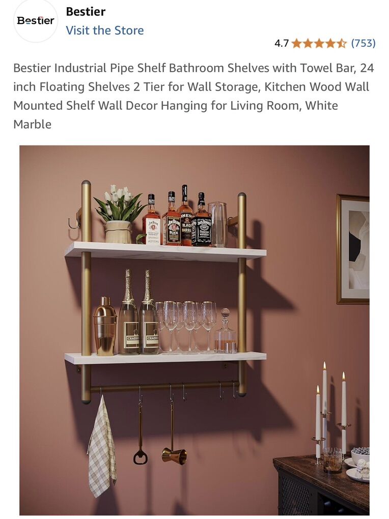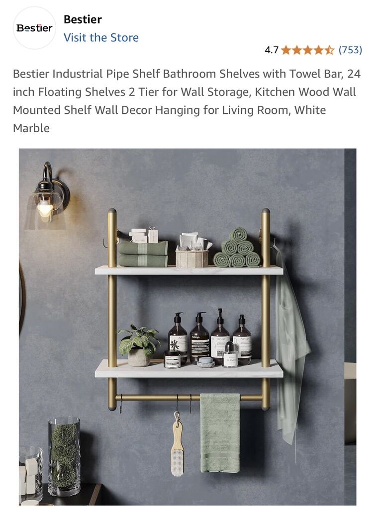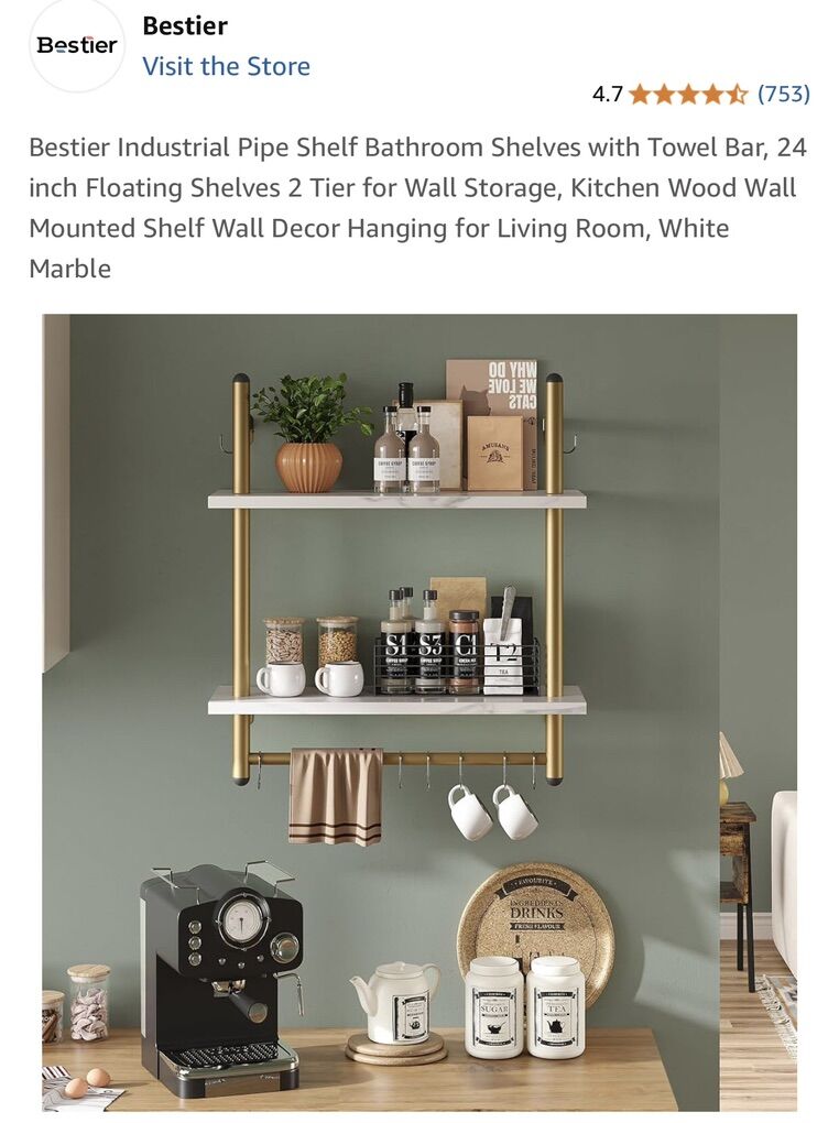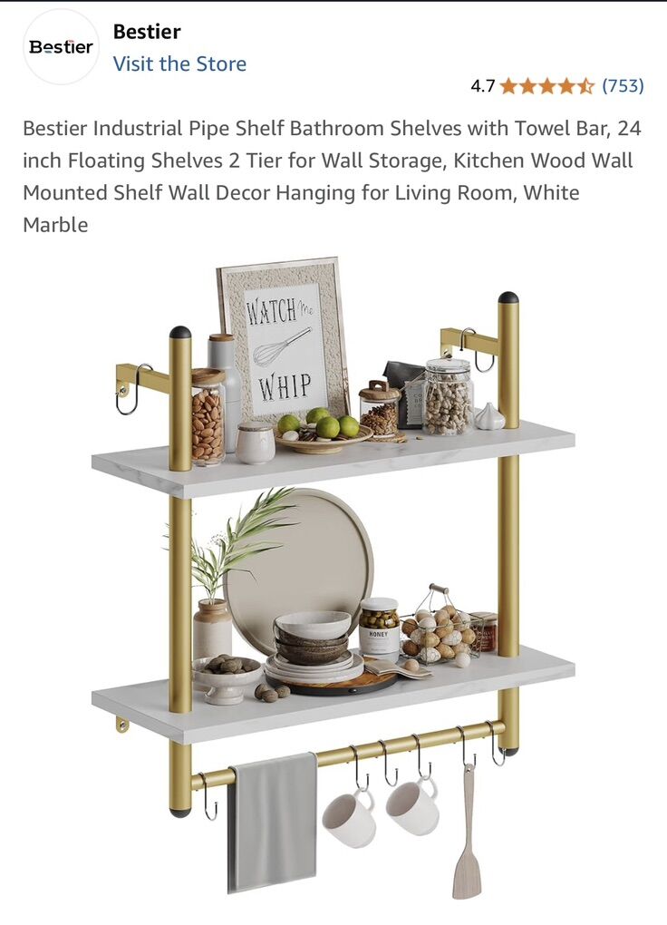 Brand New in Box Industrial Pipe 2 Shelf Gold Finish White Marble Shelves Great for any room