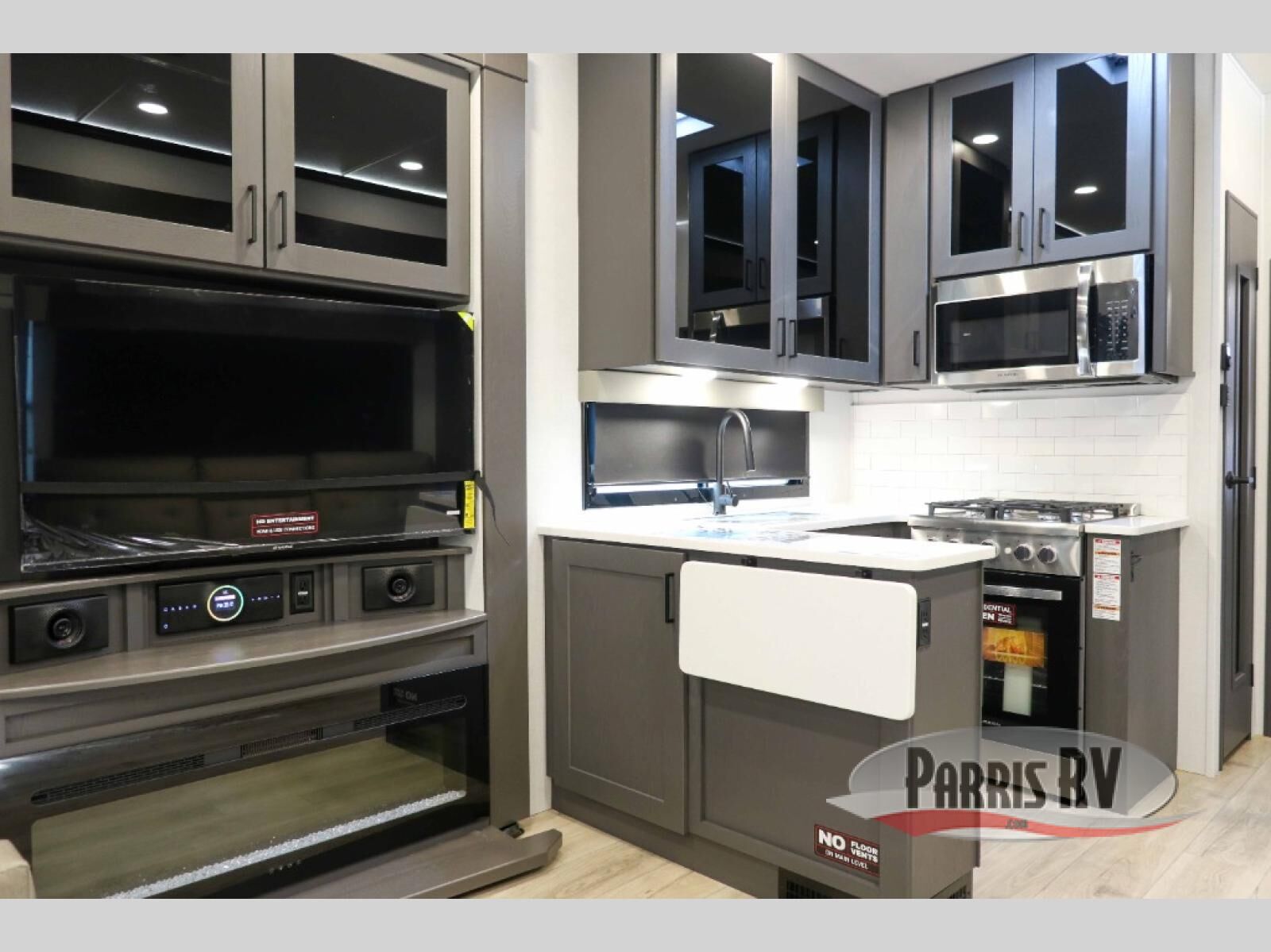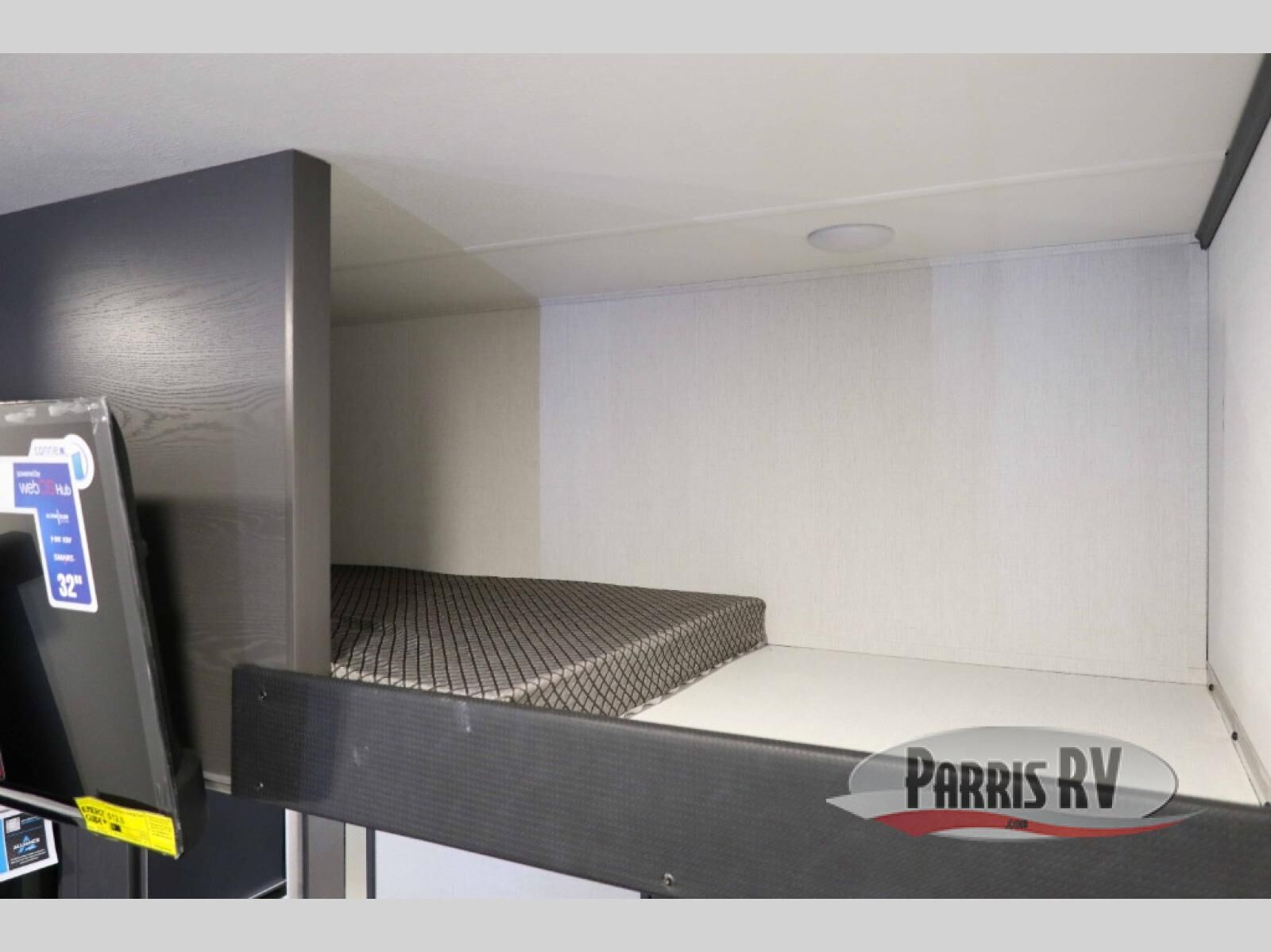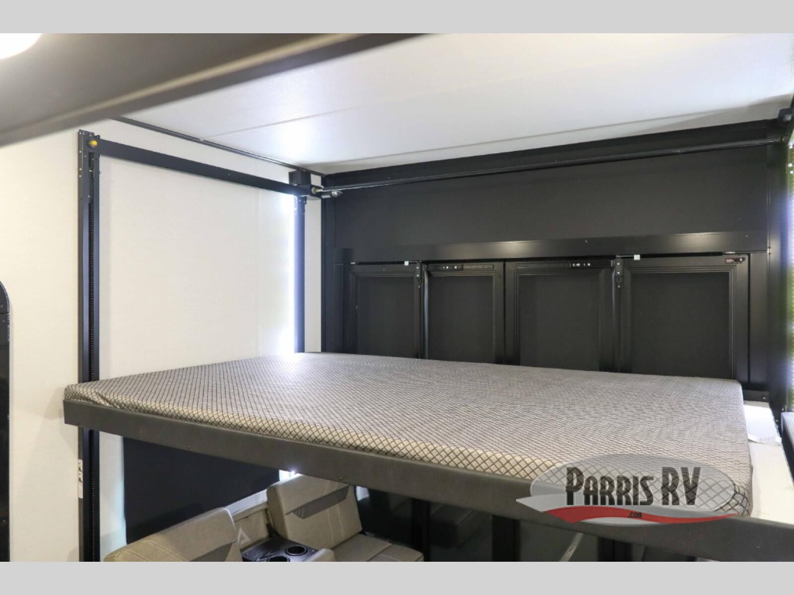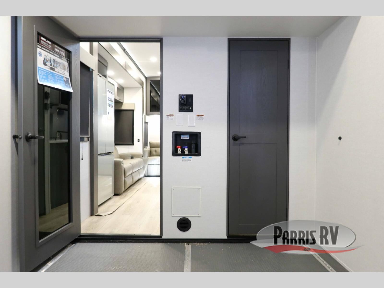 There is room for your off-road toys and the whole family in this toy hauler! The bath and a half makes life more convenient and the dual entry doors create a smooth flow of traffic in and out of the unit. Aside from 13' of garage space, an air compressor, and an entrance/exit door, there are also opposing HappiJac sofas with a queen bed above them, a loft that opens to the garage, and a half bathroom. The chef can prepare their best meals with the four burner cooktop while two others sit at the flip up counter with two bar stools. After a fun day on the trails, wash up in the full bathroom with the 48" x 30" shower, grab your pajamas from the front wardrobe or flip top dresser in the front private bedroom then relax on one of the two sofas by the fireplace and 50" HDTV!