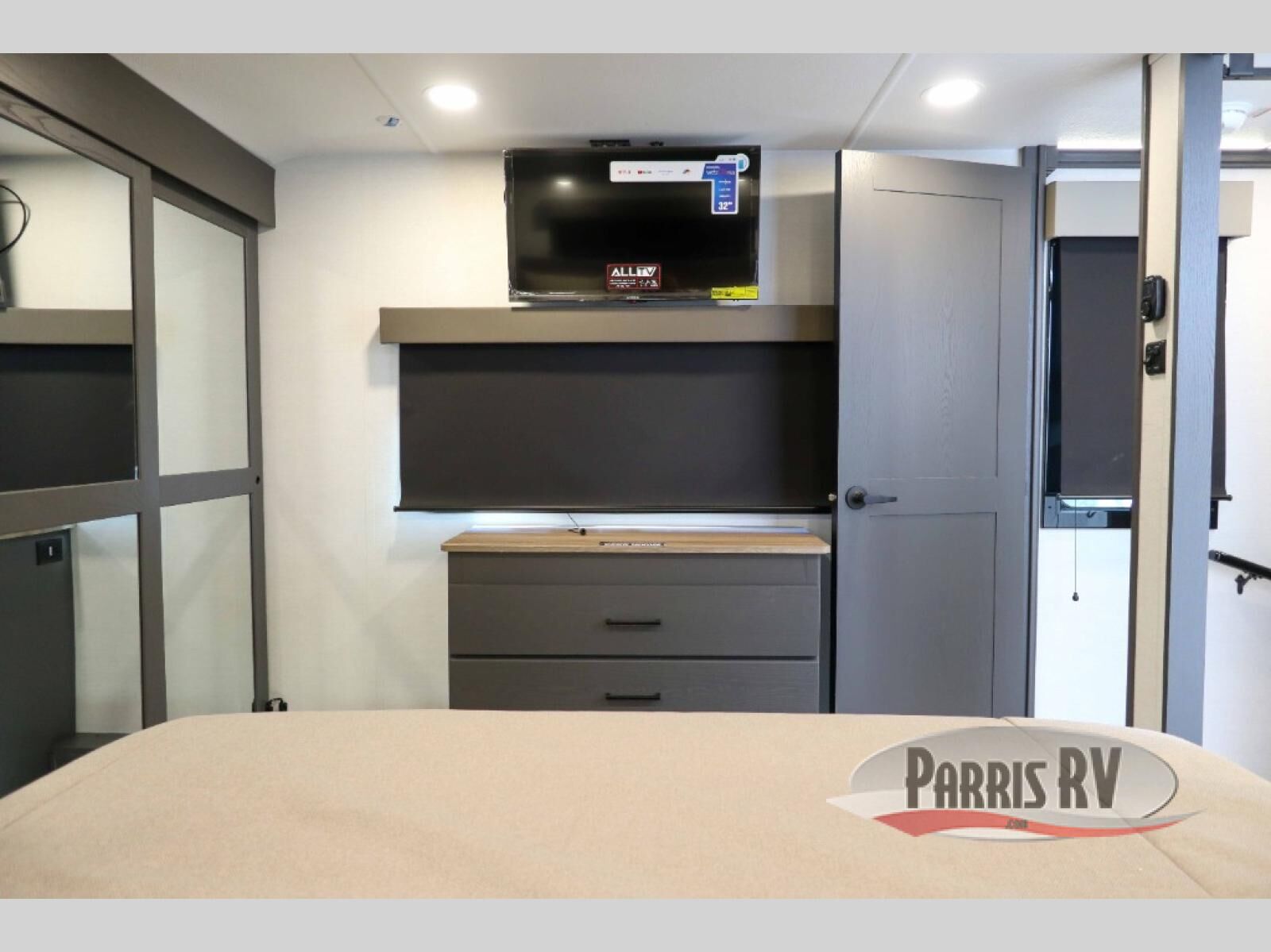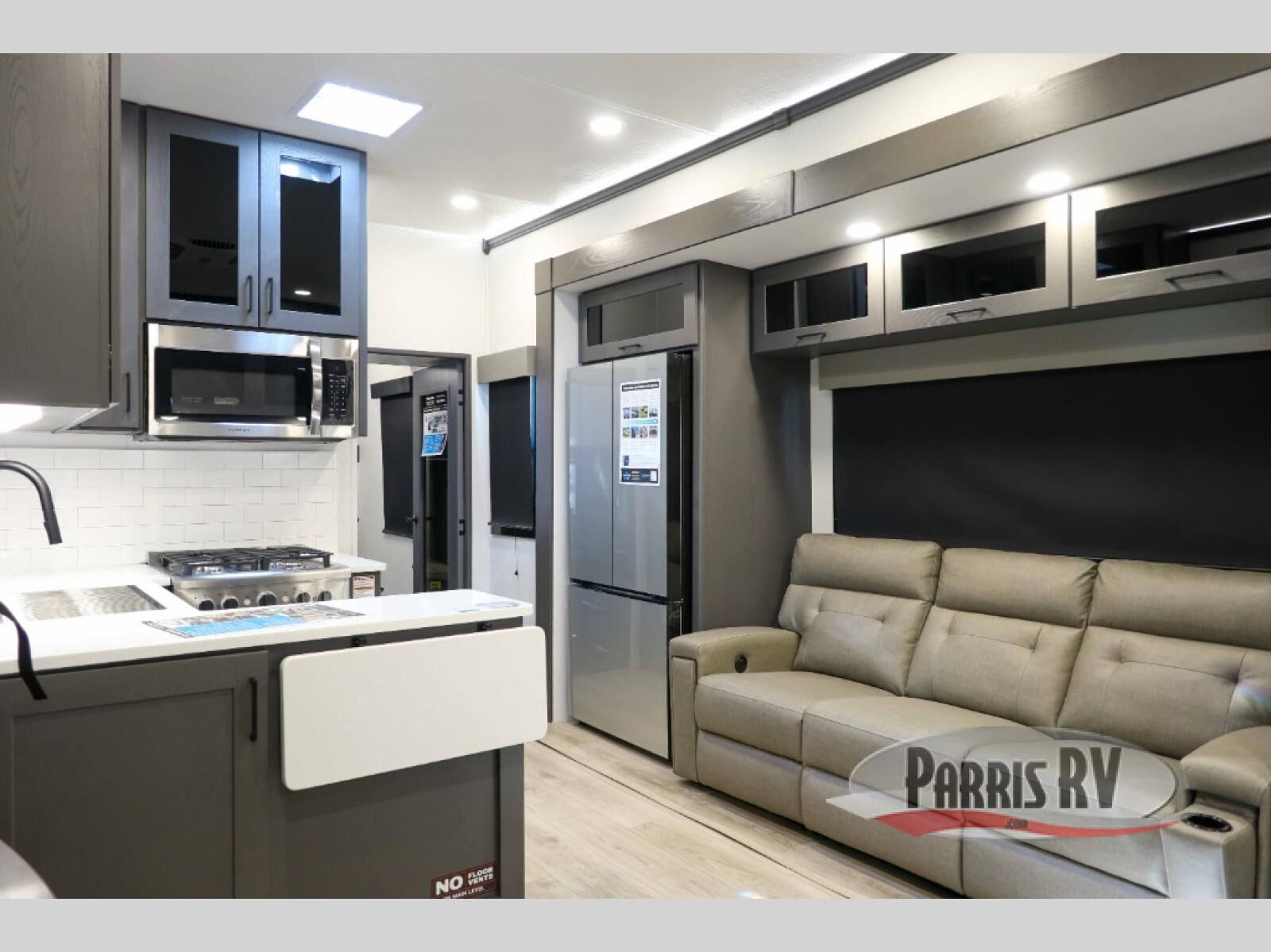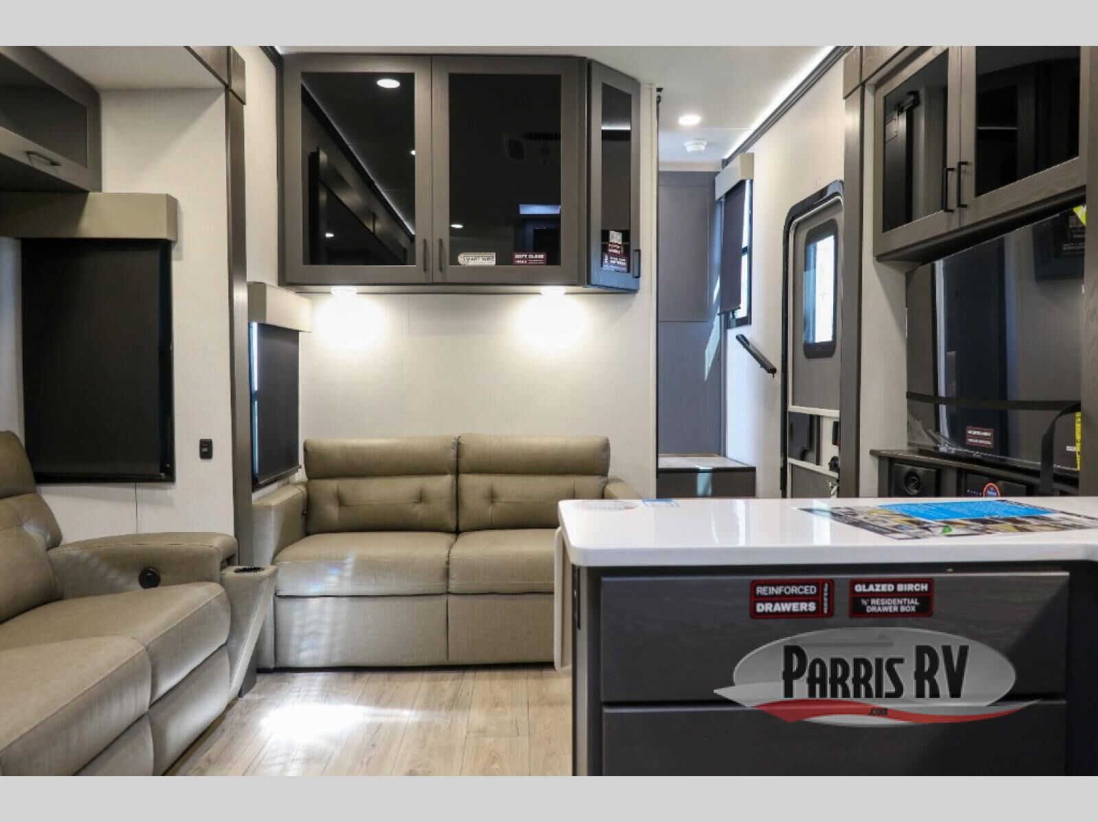 There is room for your off-road toys and the whole family in this toy hauler! The bath and a half makes life more convenient and the dual entry doors create a smooth flow of traffic in and out of the unit. Aside from 13' of garage space, an air compressor, and an entrance/exit door, there are also opposing HappiJac sofas with a queen bed above them, a loft that opens to the garage, and a half bathroom. The chef can prepare their best meals with the four burner cooktop while two others sit at the flip up counter with two bar stools. After a fun day on the trails, wash up in the full bathroom with the 48" x 30" shower, grab your pajamas from the front wardrobe or flip top dresser in the front private bedroom then relax on one of the two sofas by the fireplace and 50" HDTV!