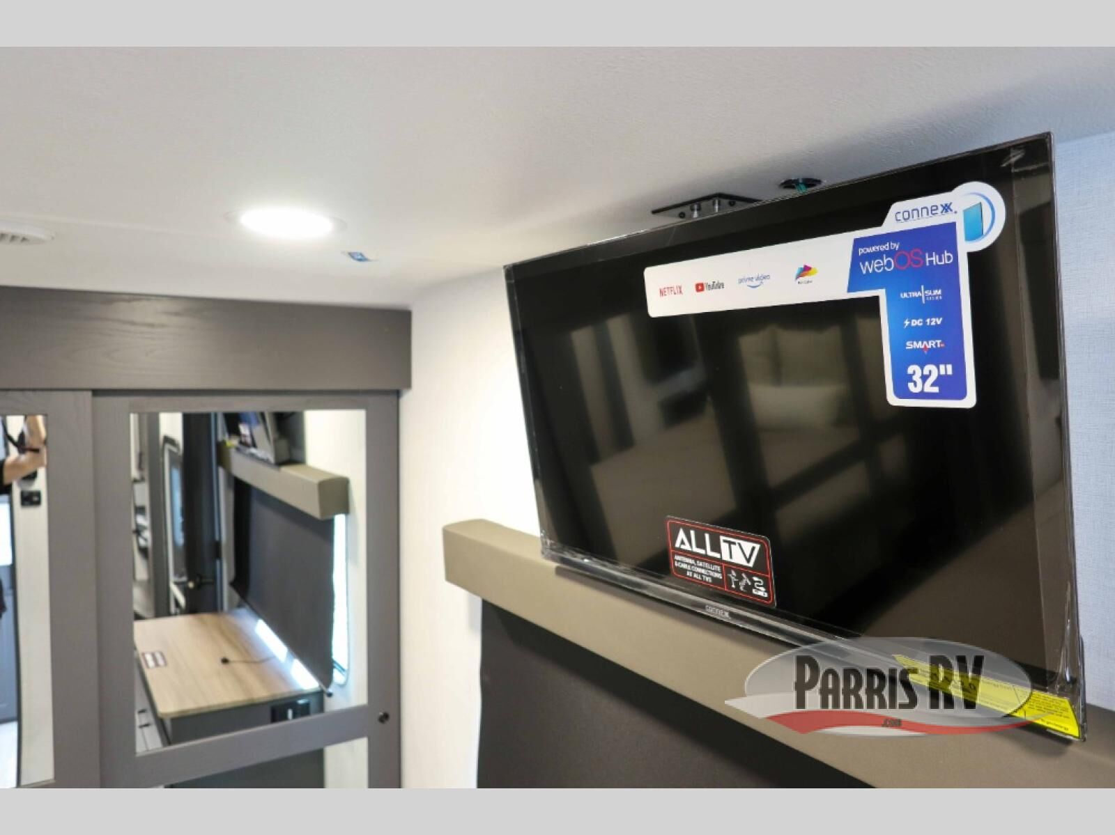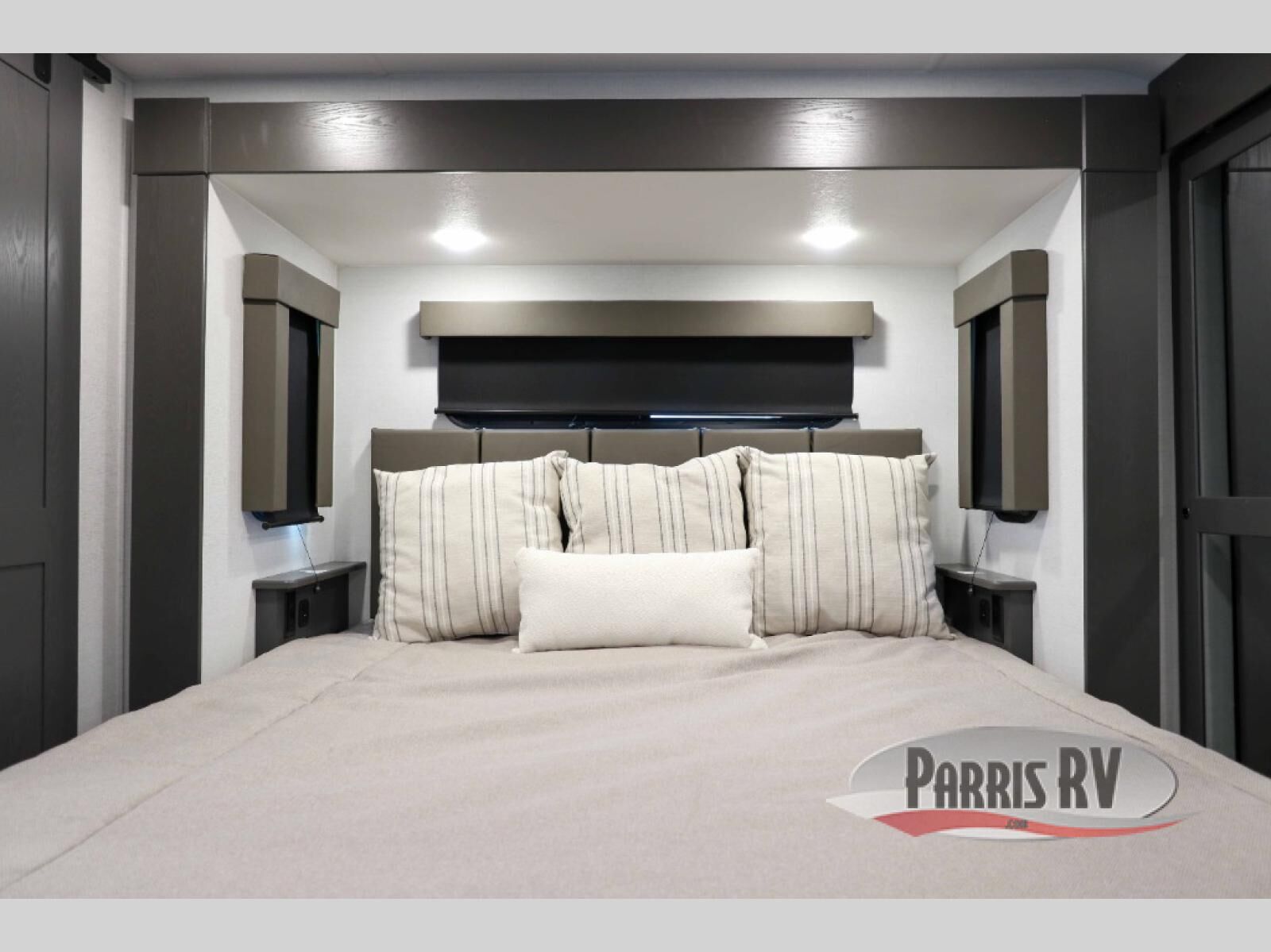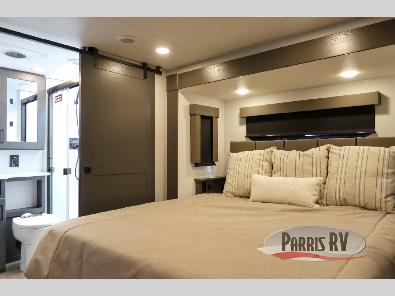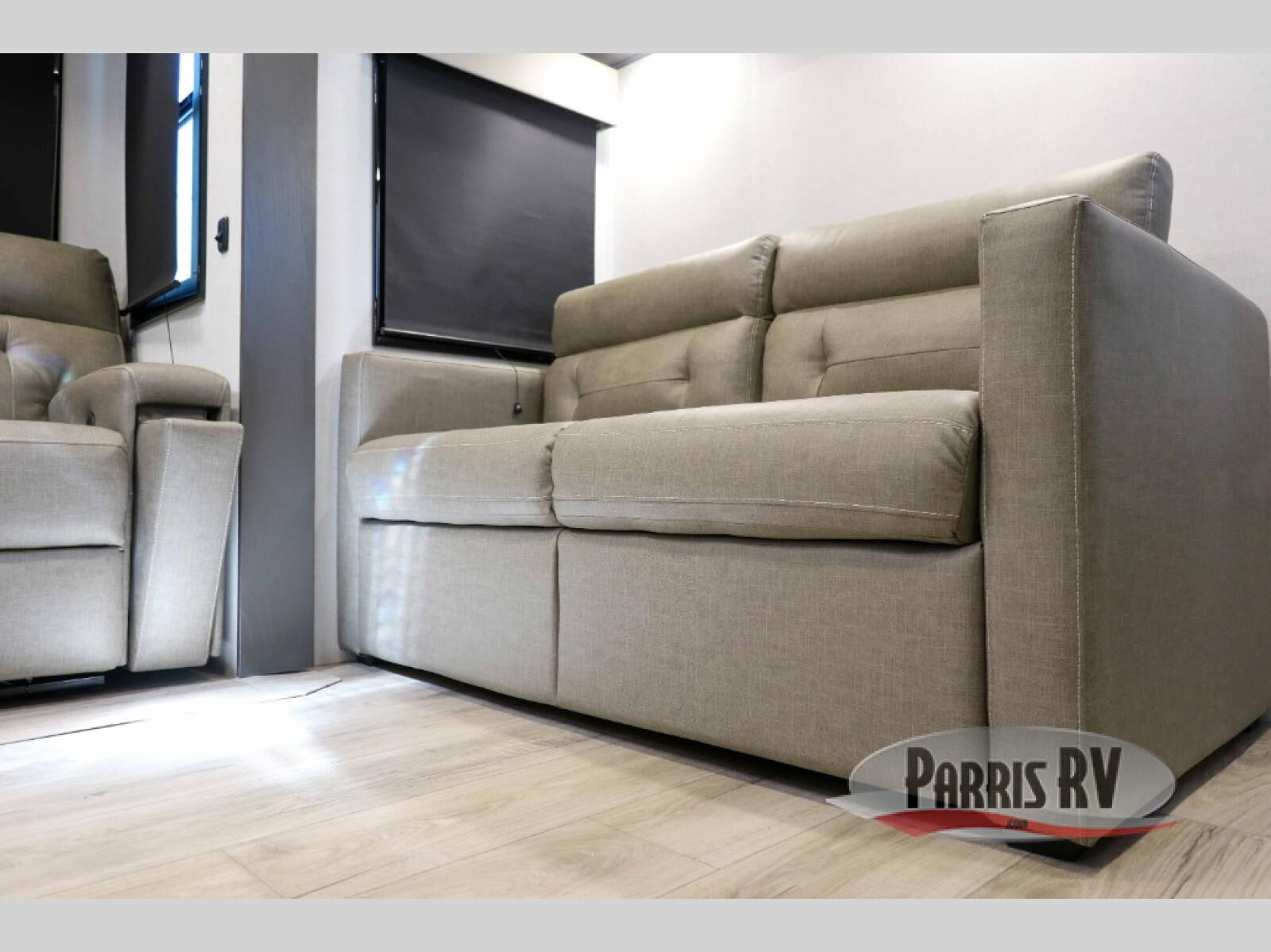 There is room for your off-road toys and the whole family in this toy hauler! The bath and a half makes life more convenient and the dual entry doors create a smooth flow of traffic in and out of the unit. Aside from 13' of garage space, an air compressor, and an entrance/exit door, there are also opposing HappiJac sofas with a queen bed above them, a loft that opens to the garage, and a half bathroom. The chef can prepare their best meals with the four burner cooktop while two others sit at the flip up counter with two bar stools. After a fun day on the trails, wash up in the full bathroom with the 48" x 30" shower, grab your pajamas from the front wardrobe or flip top dresser in the front private bedroom then relax on one of the two sofas by the fireplace and 50" HDTV!