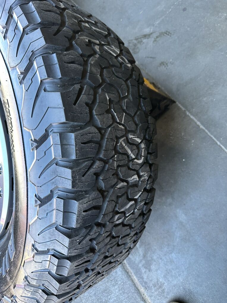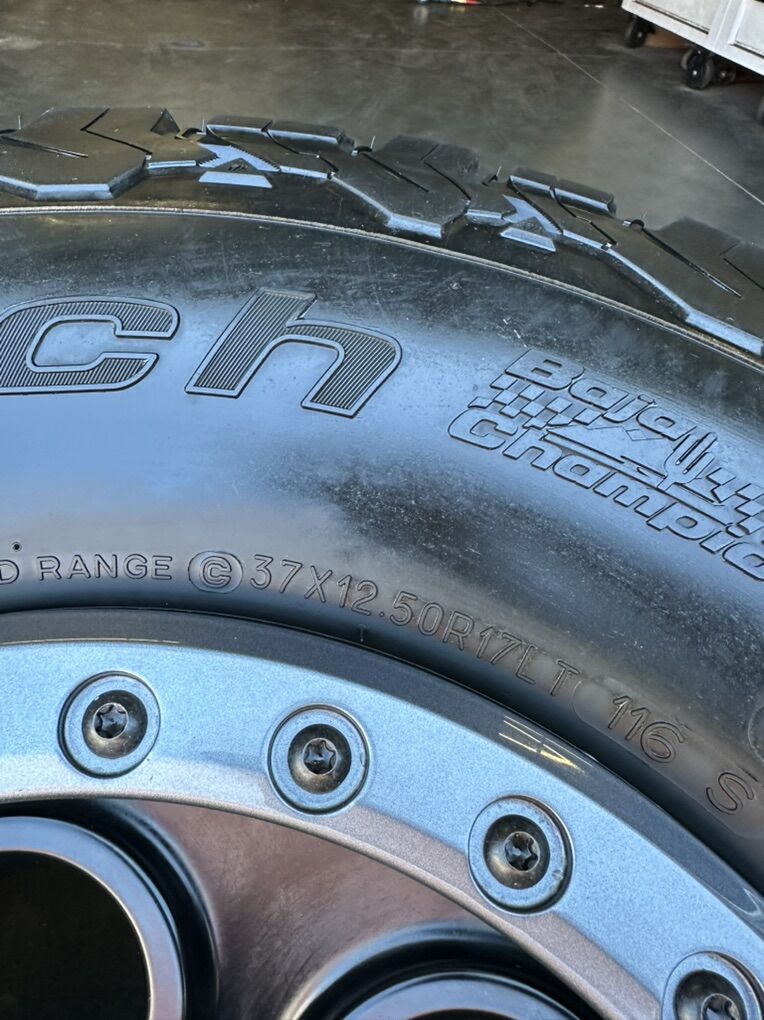 37x12.5r17 Bdgoodrich all terrains, these tires have a great piece of rubber left on them! plenty of tread remaining for the trials or for daily use, no patches or plugs, no sidewall damages, and no uneven wear. set up is balanced up, complete, and ready to go!