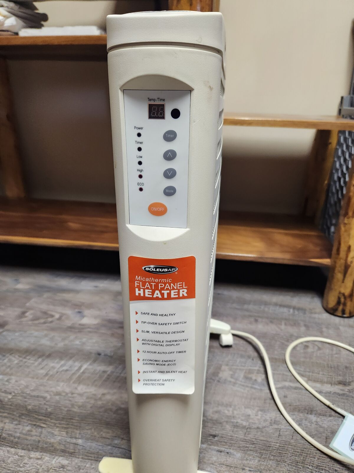 Elevate your home's comfort with the Soleusair Micathermic Flat Panel Heater. This electric portable heater offers a sleek white design, easily fitting into any room or space where additional warmth is needed. With four distinct heat settings, it provides versatile control to tailor to your specific heating requirements. The unit features a user-friendly push-button control style for simple operation and includes a convenient timer function to schedule your heating needs. Additionally, its floor-mounted design with wheels ensures easy mobility, allowing you to move the warmth wherever it's needed most. Enjoy the blend of sophisticated design and functional heating with this panel heater.