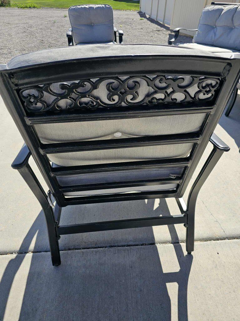 Model set 1 curved sofa and 2 rocker motion chairs Sunbrella cushions Cushions need to be cleaned from transport. This is a heavy duty sturdy set! Sofa: 101.75"W x 44"D x 35"H Chairs: 26"W x 31.5"D x 35"H