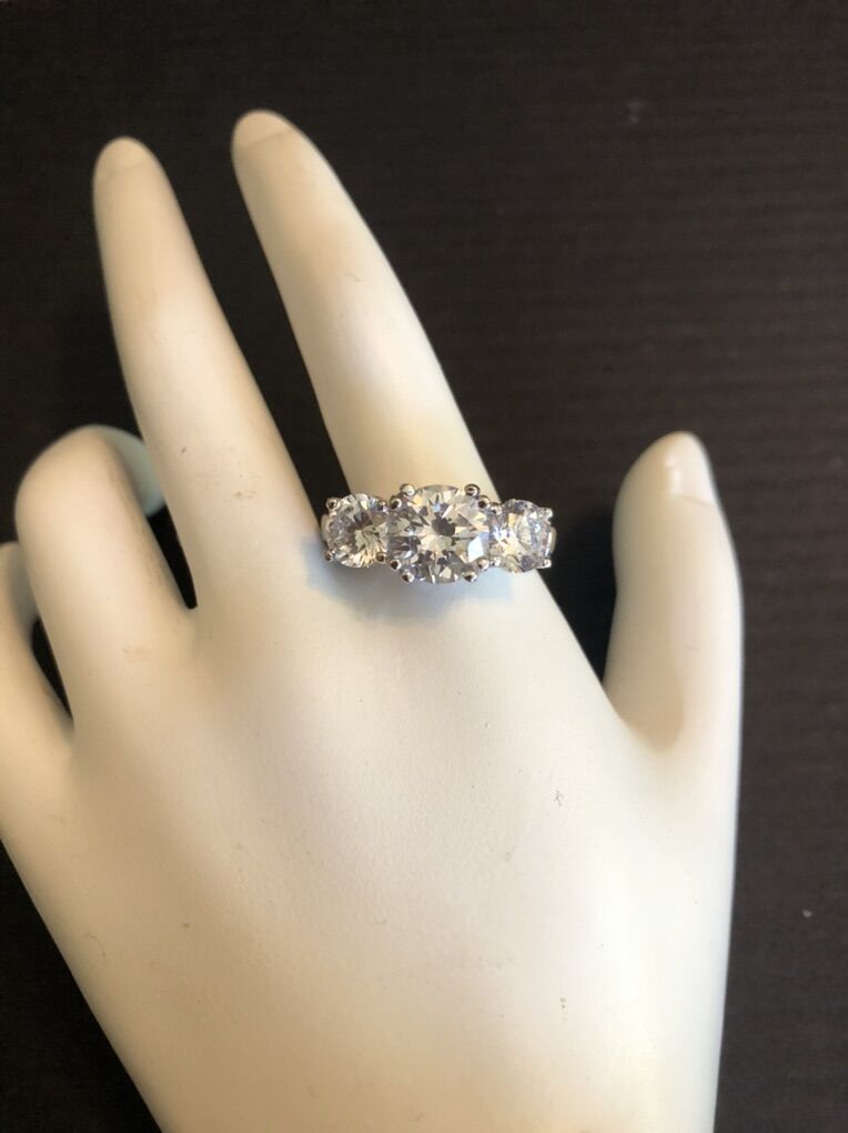 Brilliant sterling silver ring with three large simulated diamonds and beautiful decorative metalwork. Size 7. New in box!