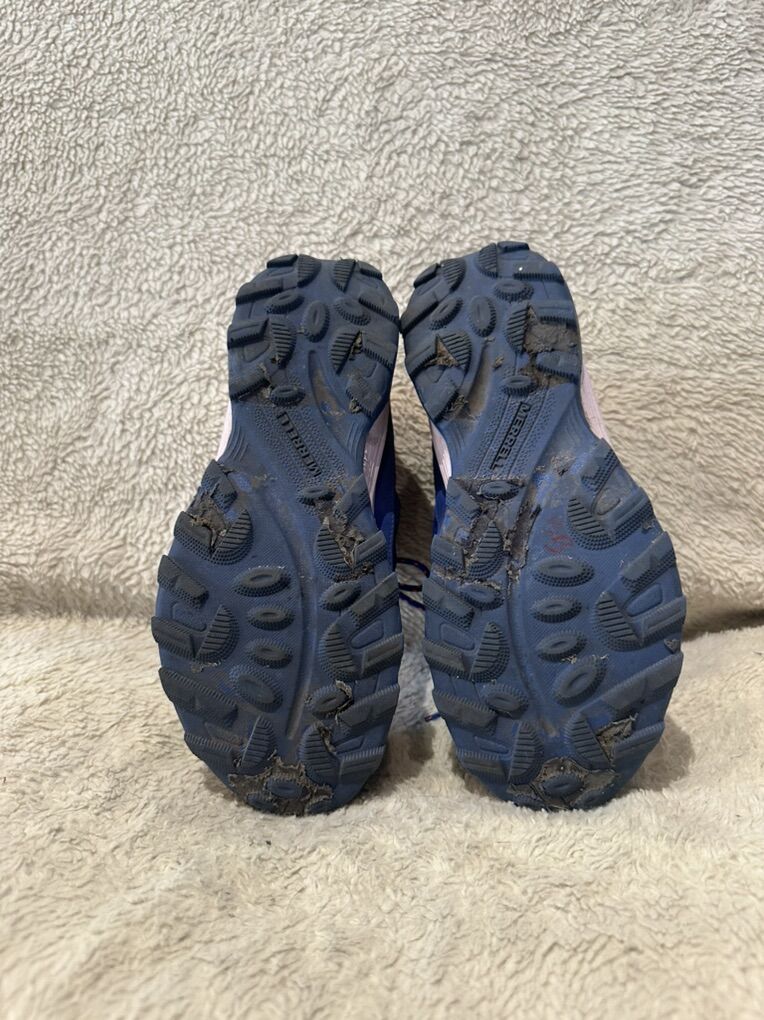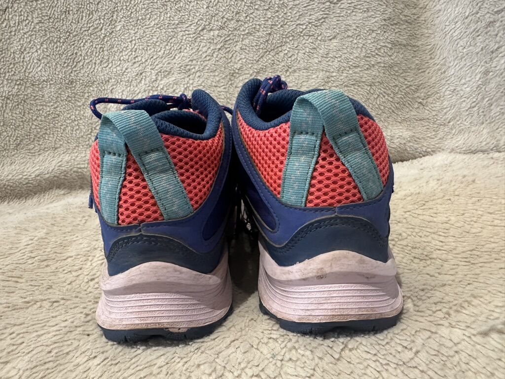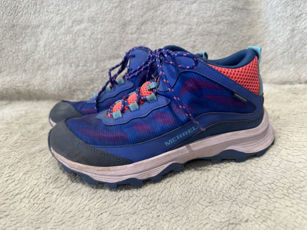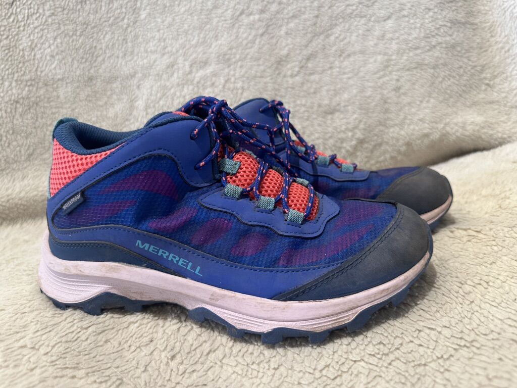 Merrell youth, size 4 blue and peach with teal trim, waterproof hiking shoes. These are in good condition, see photos for details. I take cash or Venmo, but cash is preferred. Text is best. 801-201-4446. Check out my other ads for additional sizes and styles.