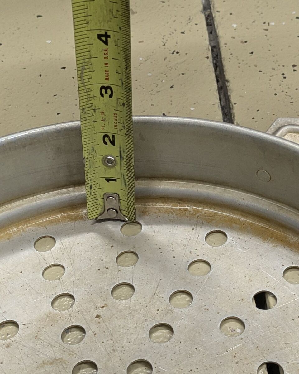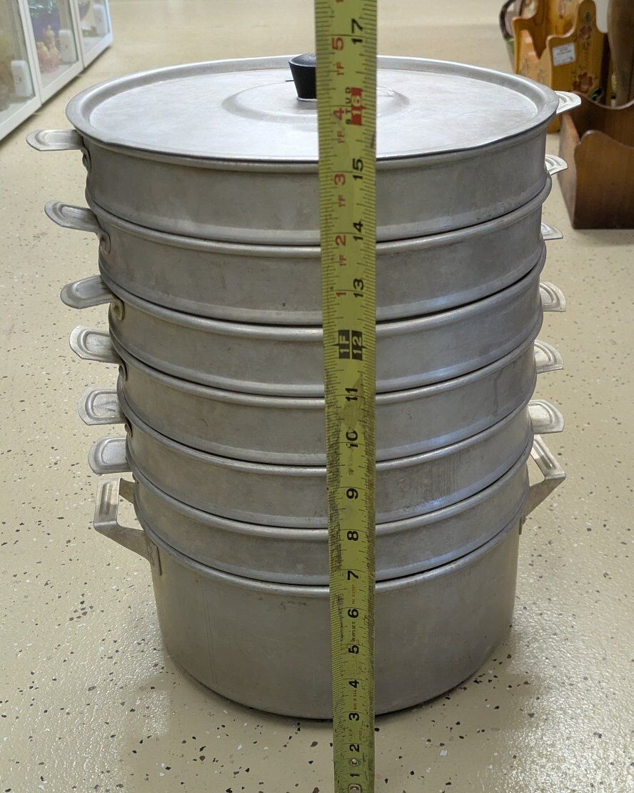 This item is cast aluminum- but a much heavier & thicker aluminum than you would find in a similar product made today. Remember that you can make more than just dumplings in it! Anything that you would steam would work well in it.