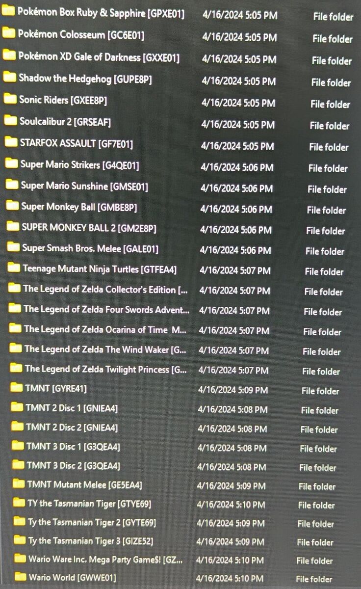 white folders are wii games and yellow folders are gamecube games