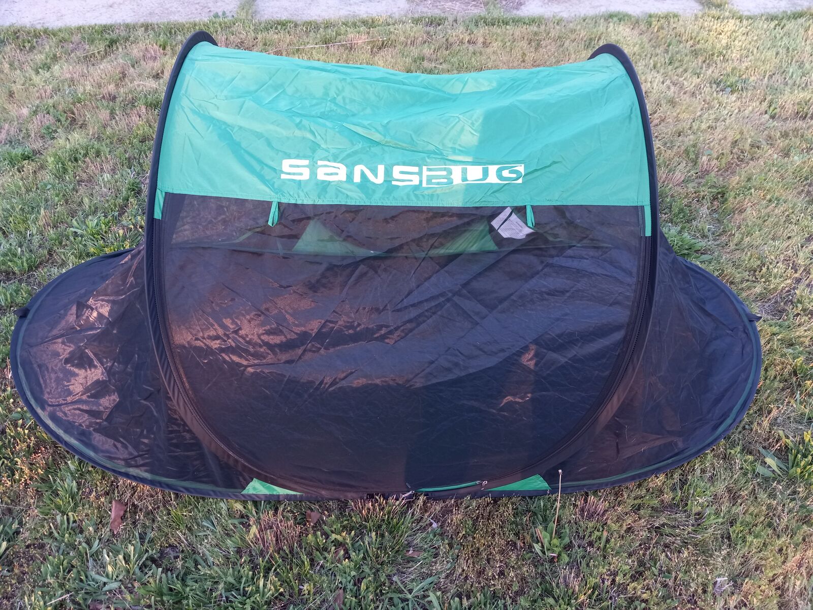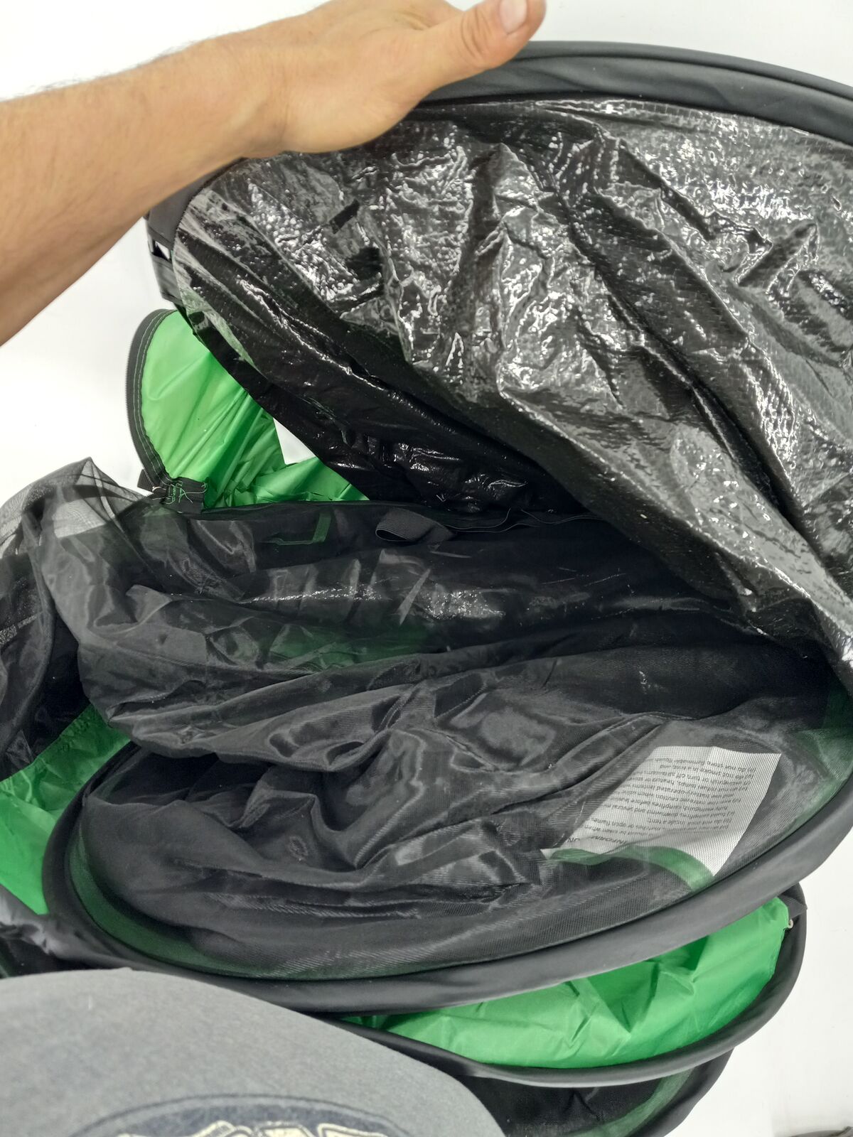 VenmoThis is a new open box product. opened and set up for pics. Lots of videos on YouTube that show how to fold it back up. Instant pop up when opened. Stakes included to secure to ground.
