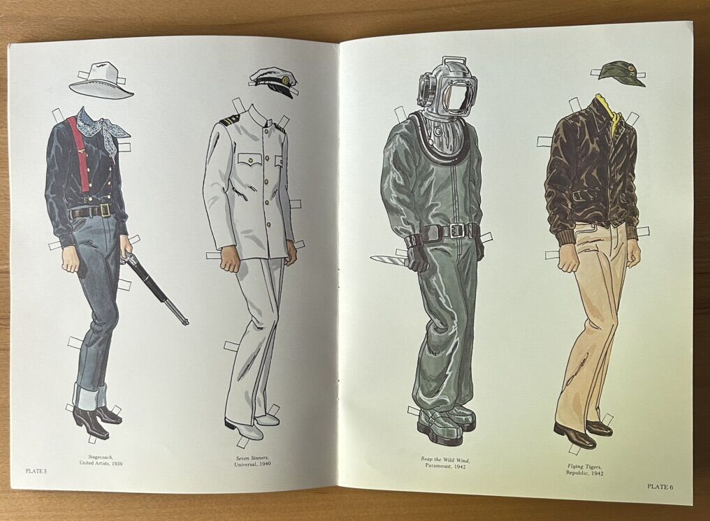 Two dolls - young and old - and 32 costumes in full color on heavy stock from 30 of John Wayne’s feature films, including The Big Trail, Stagecoach, Fort Apache, Sands of Iwo Jima, True Grit, The Shootist. Authentic costumes, beautifully rendered by noted fashion designer. Ready to cut out. Book includes a nice introduction and captions on each page.