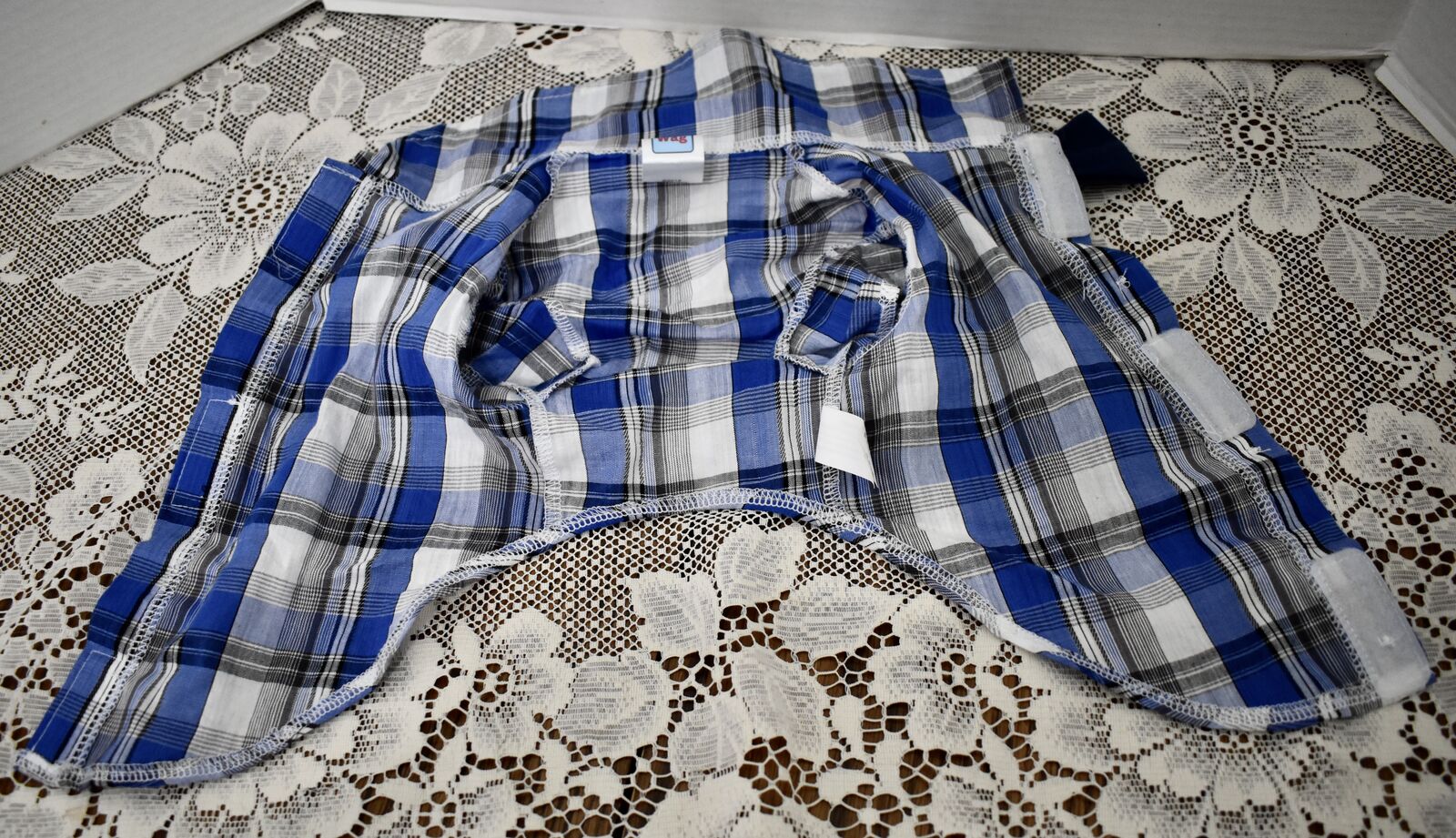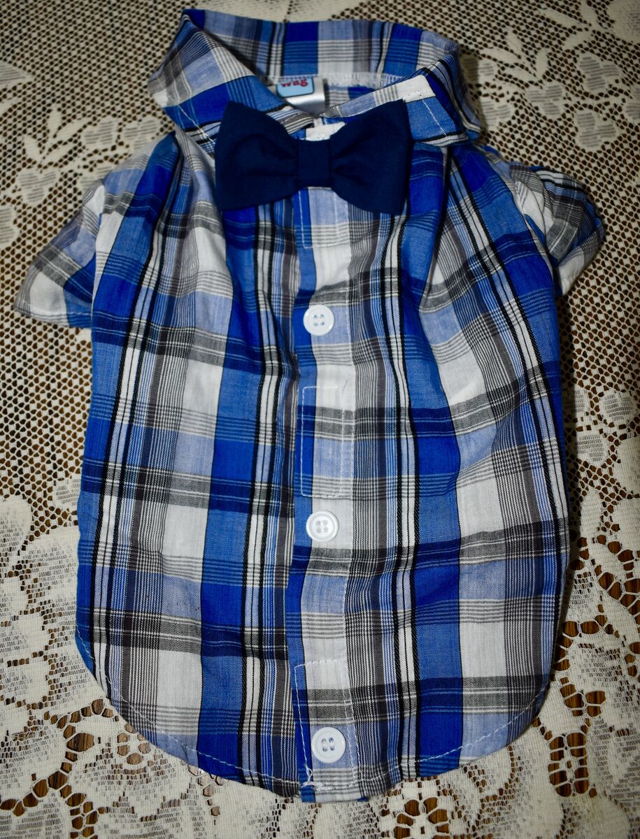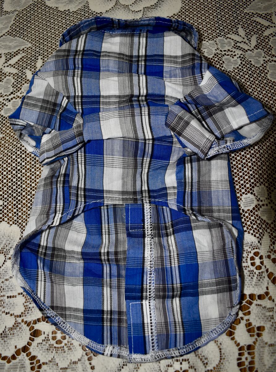 **IT MEASURES…**At the very front center it measures approx. 11 inches long, At the side it measures approx. 8 inches long, and at the very back it measures approx. 8 3/4 inches long. The shirt collar measures approx. 3 inches long and folds down onto the shirt. When it is done up with the velcro closed it measures approx. 12 inches across from side to side under the arm areas and 4 inches from the back side to side arm area.
