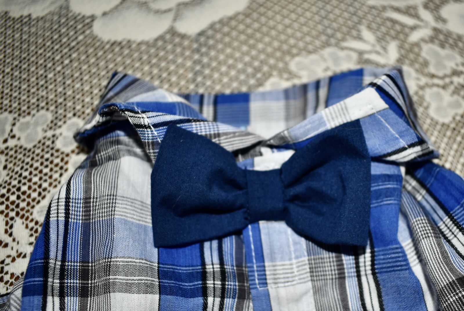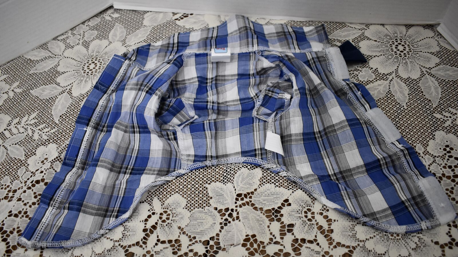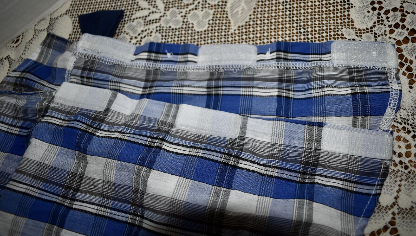 **IT MEASURES…**At the very front center it measures approx. 11 inches long, At the side it measures approx. 8 inches long, and at the very back it measures approx. 8 3/4 inches long. The shirt collar measures approx. 3 inches long and folds down onto the shirt. When it is done up with the velcro closed it measures approx. 12 inches across from side to side under the arm areas and 4 inches from the back side to side arm area.