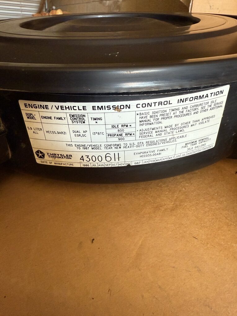 ApplePayNOS 1986 Dodge LA 360 V8 carburetor setup air cleaner filter housing assembly with EGR emissions valve and tubing. This is OEM factory assembly that has never been installed. Have original shipping box and packing slip for this assembly. Sent from Chrysler Corp in 1986. May fit 1987 and 1988 engines as well that have carburetors.