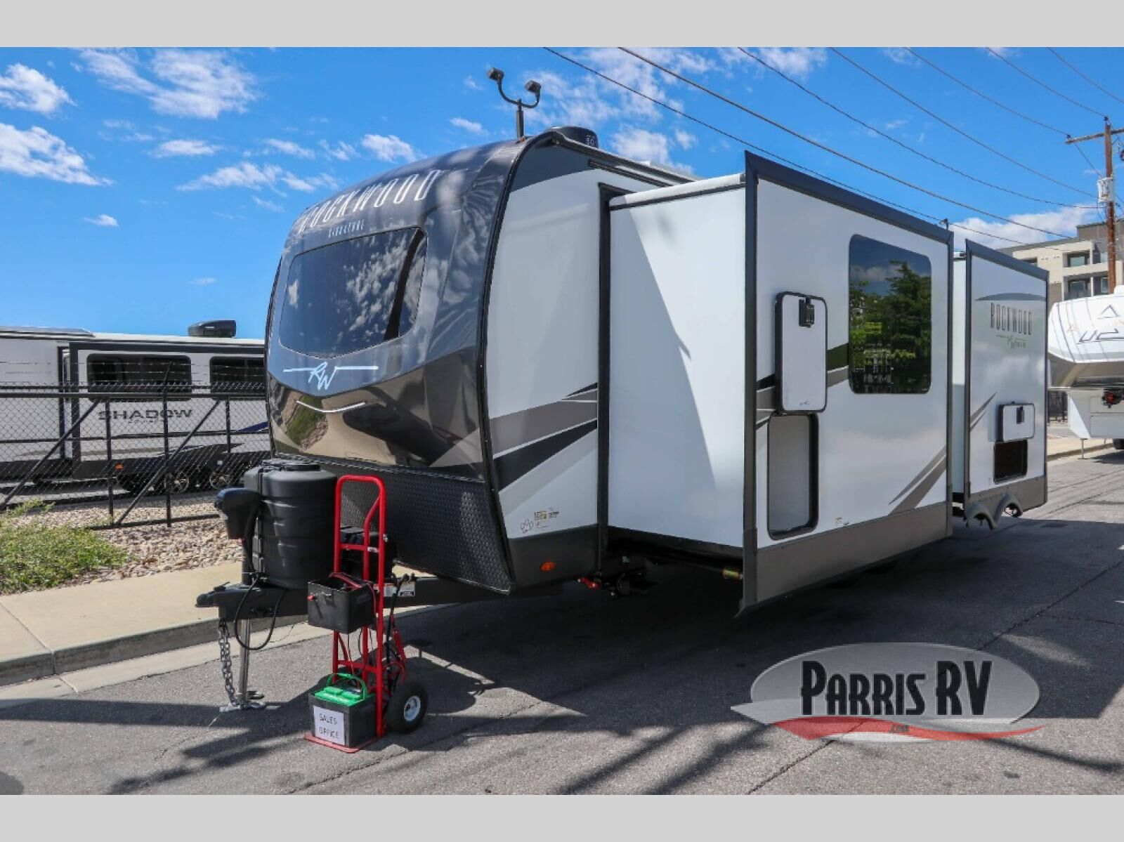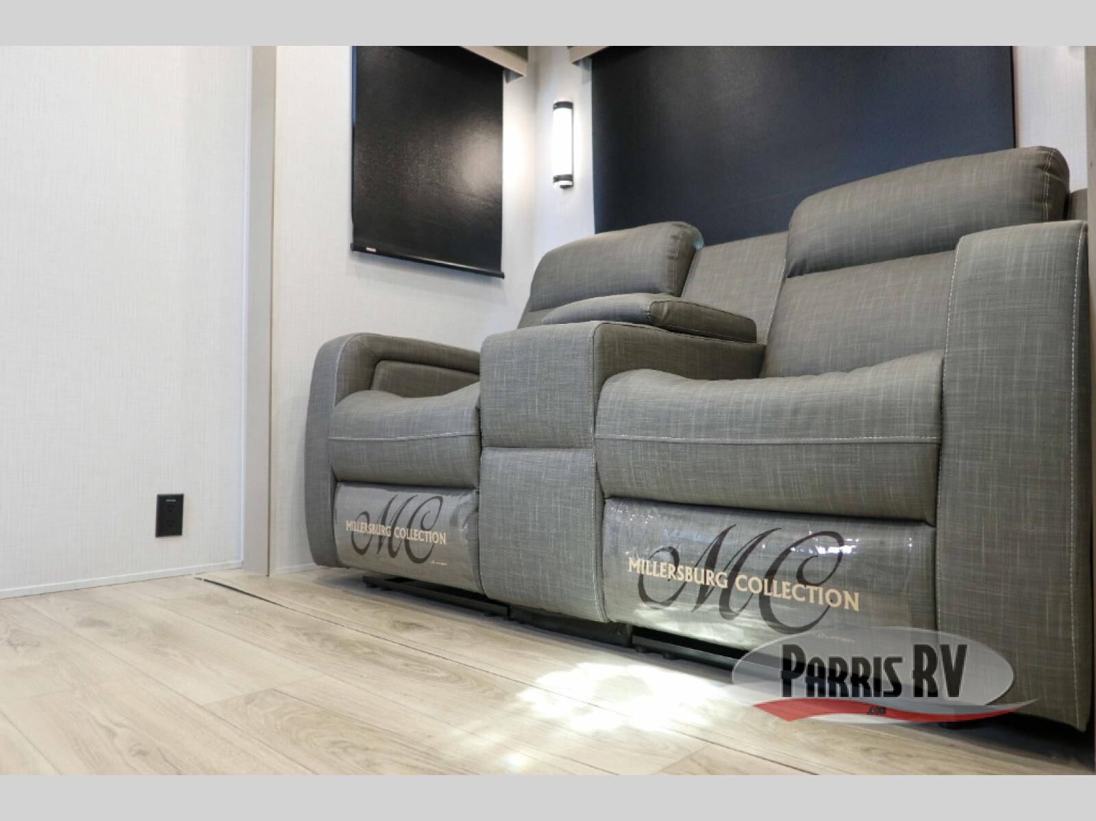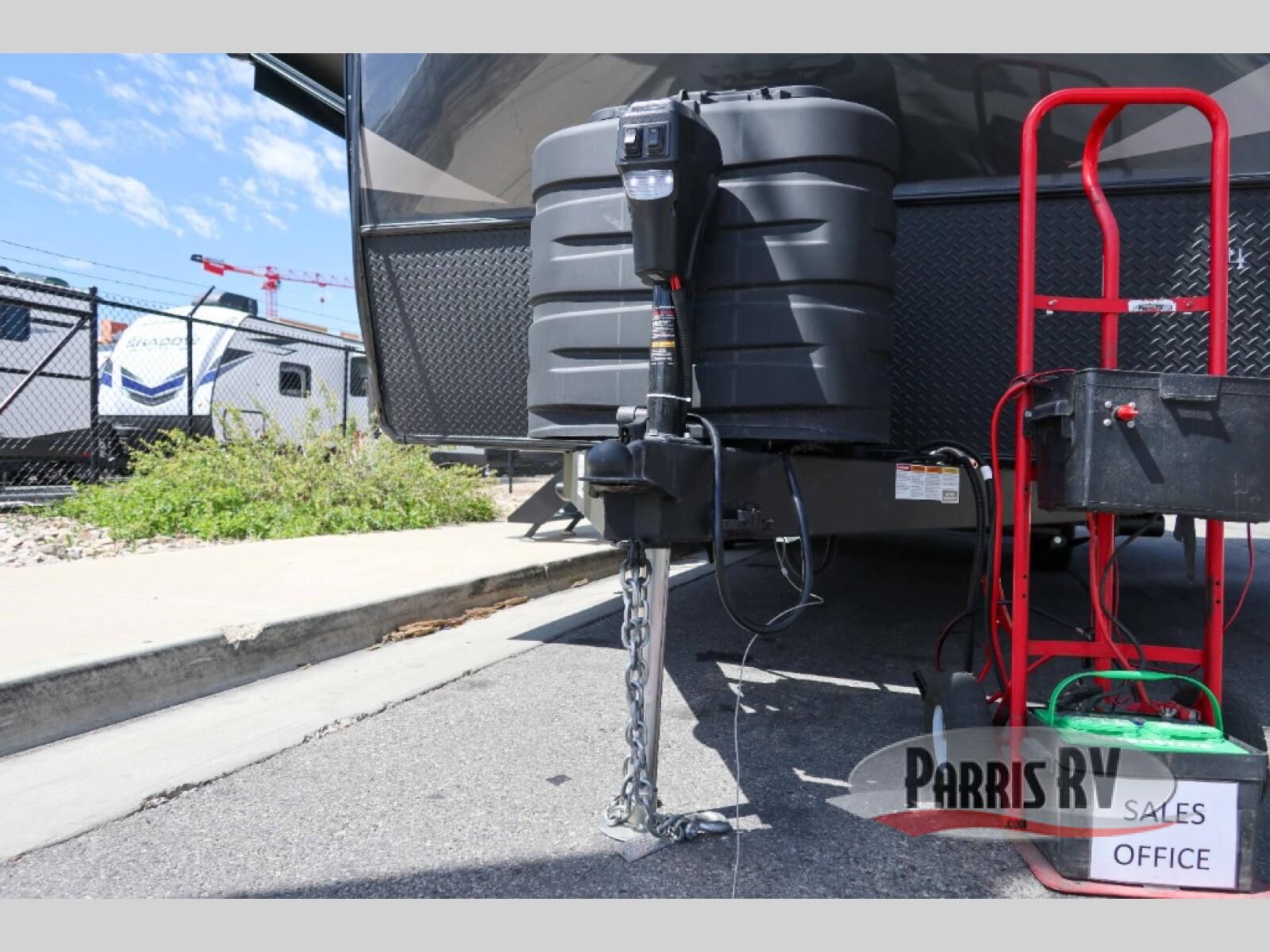 This front kitchen, couple's trailer is ready for adventure when you are! Once you arrive at your destination, prepare a quick lunch on the outside griddle, and enjoy the shade provided by the 19' power awning. You can eat outside, or inside at the counter with stools. The theatre seat will make this travel trailer feel more like home, and the double slides provide more space to stretch out. Within the master bedroom you'll find a king bed, a large wardrobe and a dresser, plus an optional TV. And check out the full rear bath with dual bath sinks and a shower with a seat! Now, that's what I call comfort!