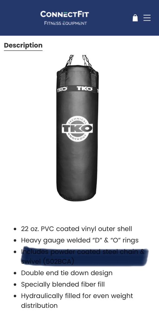 VenmoTKO 50lbs Punching Bag. Roughly 3’x1’ in size. Good condition. See pics for details. $60obo