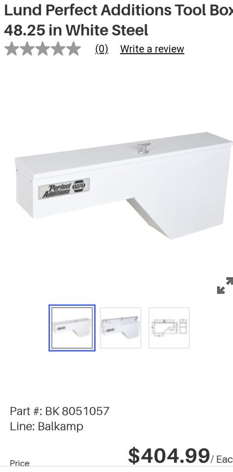 LOWER PRICE! New Napa 805-1057 perfect additions white steel truck tool box w/lock 48.25" L X 21" D X 8.5" W made in the USA . It has 3 shelves 1 slides. cash only