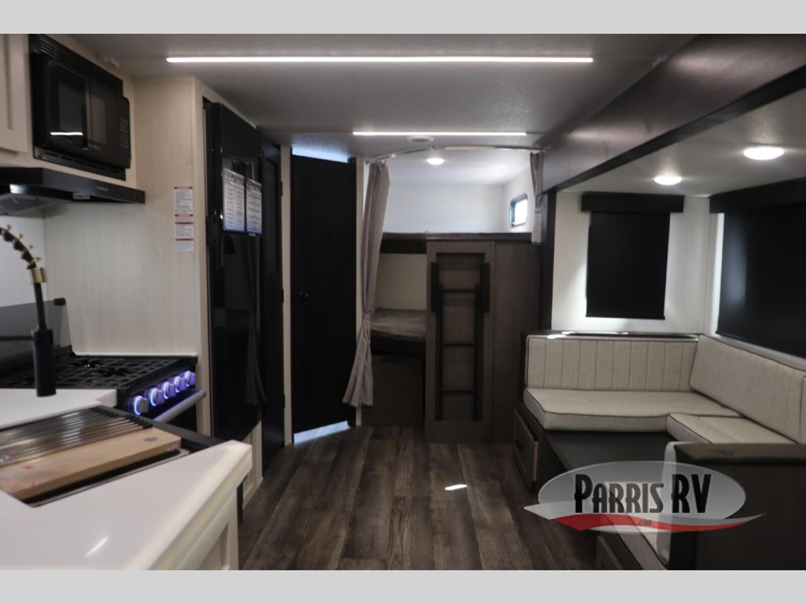 Looking for a multi-sleeper trailer to sleep nine to ten happy campers? You've found it in this dual entry model with an outside kitchen, double-size bunks, and a large slide out! The main living and kitchen area has a U-shaped dinette to utilize as a dining table, game table, work station, and/or an extra sleeping space. You will also find a hidden pantry behind the entertainment center and full kitchen amenities including a large sink and a residential-style refrigerator. The exterior provides a 20' awning for an outdoor living area, outside storage, plus large steps with oversized landing and quick release for convenience. You will also appreciate the Juice Pack that comes with a 100W solar panel, a battery, a 30 AMP solar charger, and more!