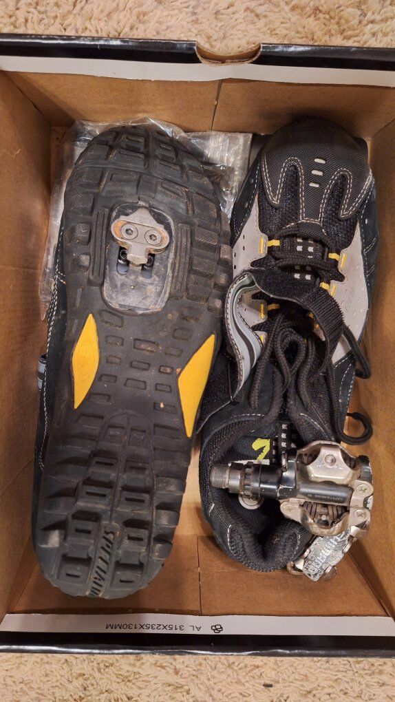 Specialized men's biking shoes and Shimano pedals. Shoes are like new, barely used, size 10. Pedals are used but still fully functional.