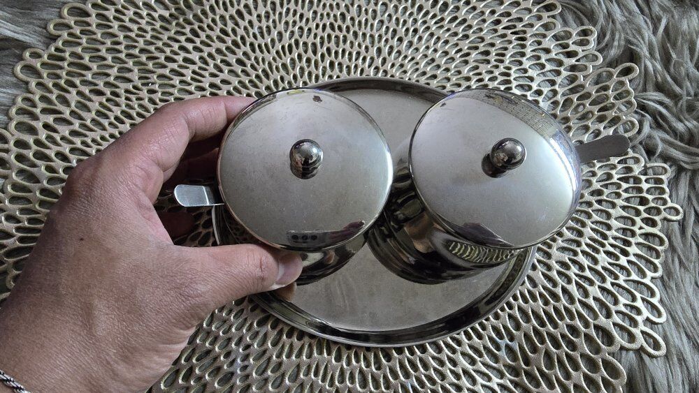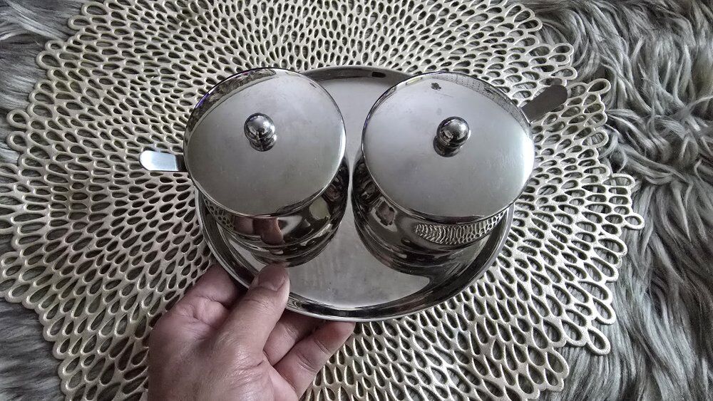 2 Grids Stainless Steel Seasoning Containers Set with Lid Spoon and Tray.