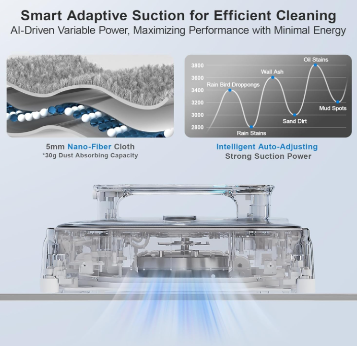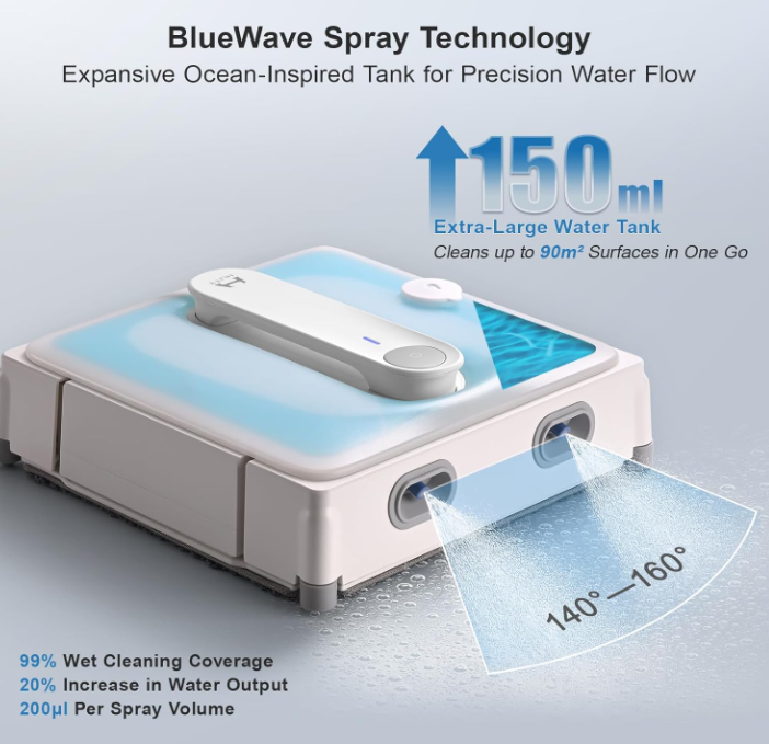 ZelleUpgraded 4 Spray Nozzles & 150ML Water TankEquipped with extra 2 nozzles, the window cleaning robot will spray sufficient water, and 150ML water tank easily covering 90㎡ only once, no more frequent refilling. 13 Smart Sensors for High Precision DetectionEven frameless glasses cleaning is nothing difficult due to ultra-advanced laser edge detection technology, and Intelligent frequency conversion will automatically adjust the suction power helping crossing small gap. 3800Pa Self-regulating Suction PowerWith the HUTThink AI algorithm, the HUTT W8 robot window cleaner will detect the degree of dirt and adjust the suction power from 1800Pa to 3800Pa accordingly for a secure hold and prevent scratches.