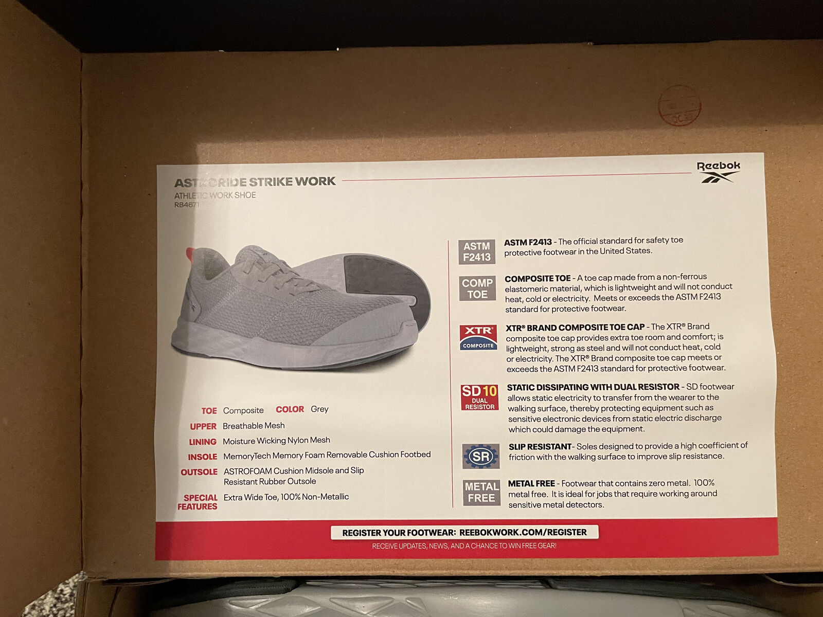 *Brand New Shoes, Never Worn *Great steel toed shoes for work *Size 10.5 W *Comfortable, great for warehouse work *Work shoes with MemoryTech Memory foam removable cushion footbed. *Moisture wicking nylon mesh lining. *ASTROFOAM Cushion Midsole and slip resistant rubber outsole. *Composite toe. *Brand new condition. *Only used to try on. *Regular price $110.