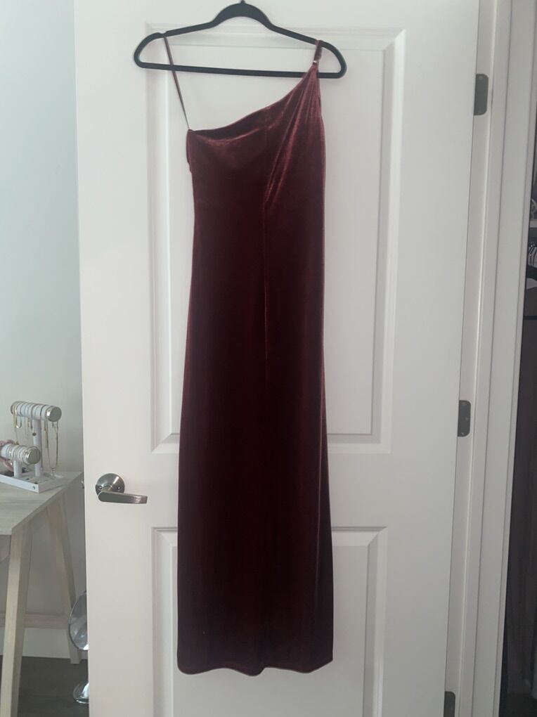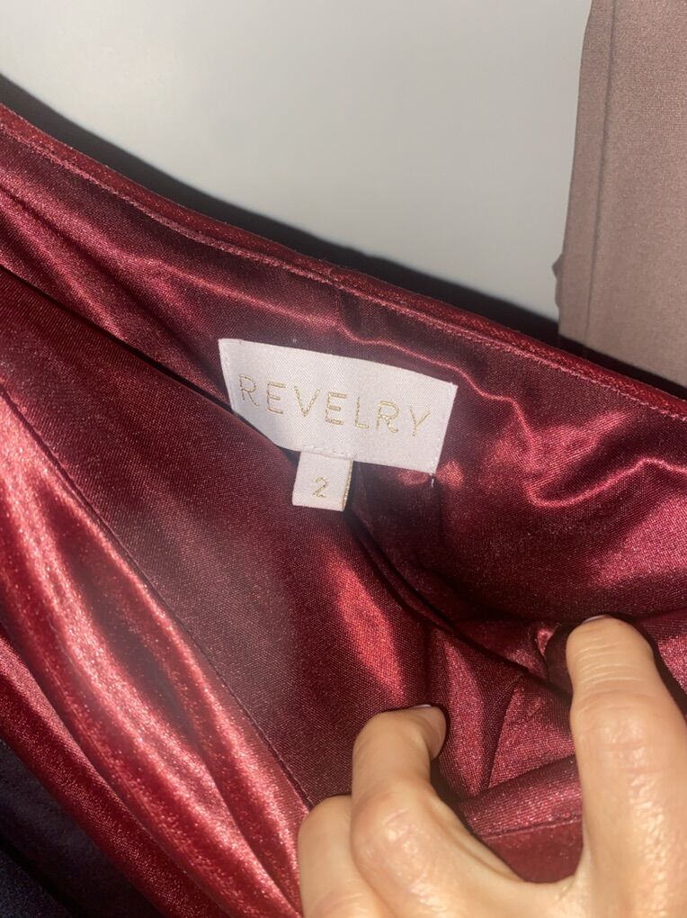 ZelleMaroon formal dress, velvet. Size 2, brand revelry. Worn once for wedding. No tears or stains, like new. Does not have sparkly strap like first picture. Everything else is exactly like first picture. Originally $200, asking for $30.