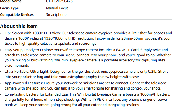 NEW IN BOX! WiFi Telescope Camera Eyepiece: 64GB Wireless Electronic Eyepiece, 1.5" Screen, 1080P FHD Video Recording, Planetary Camera for 28mm-50mm Scopes for Astrophotography, Bird Watching (32GB)