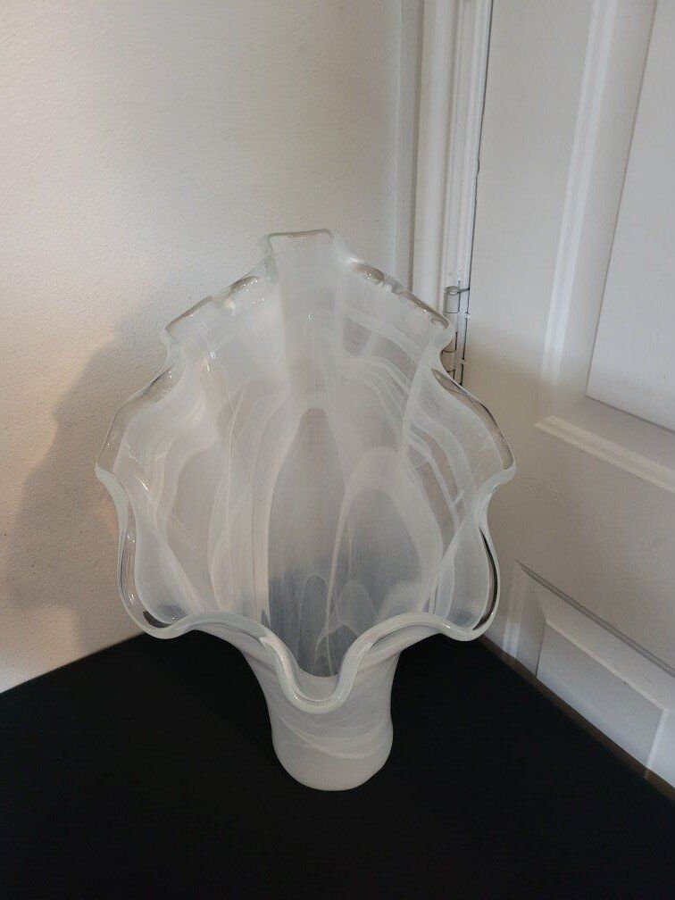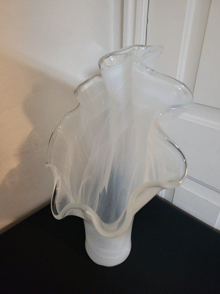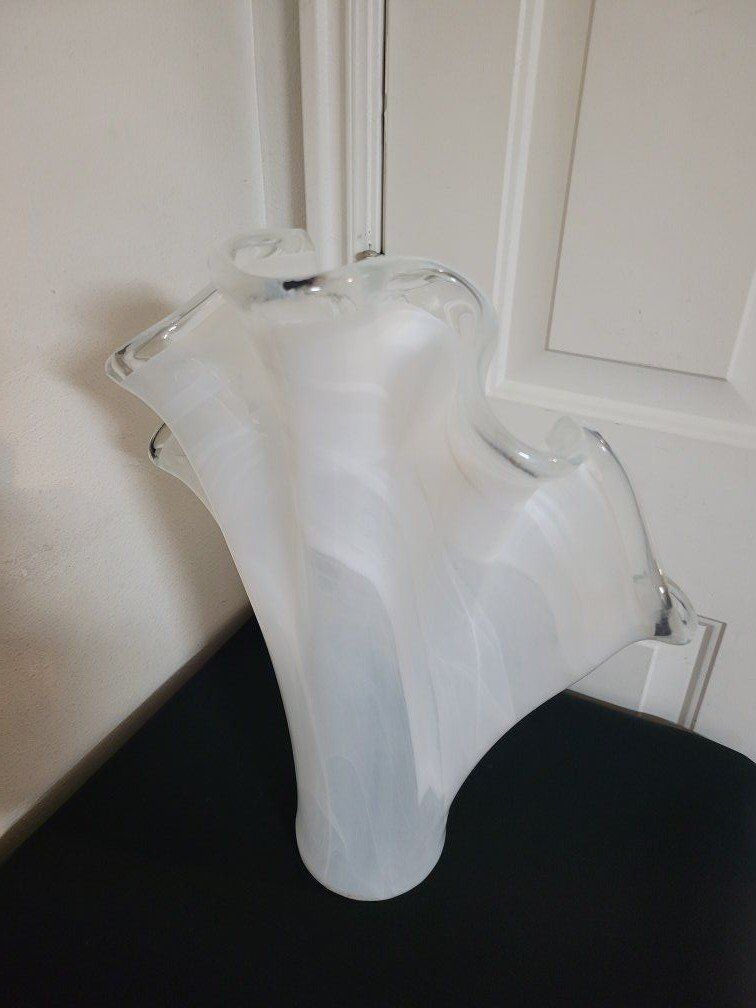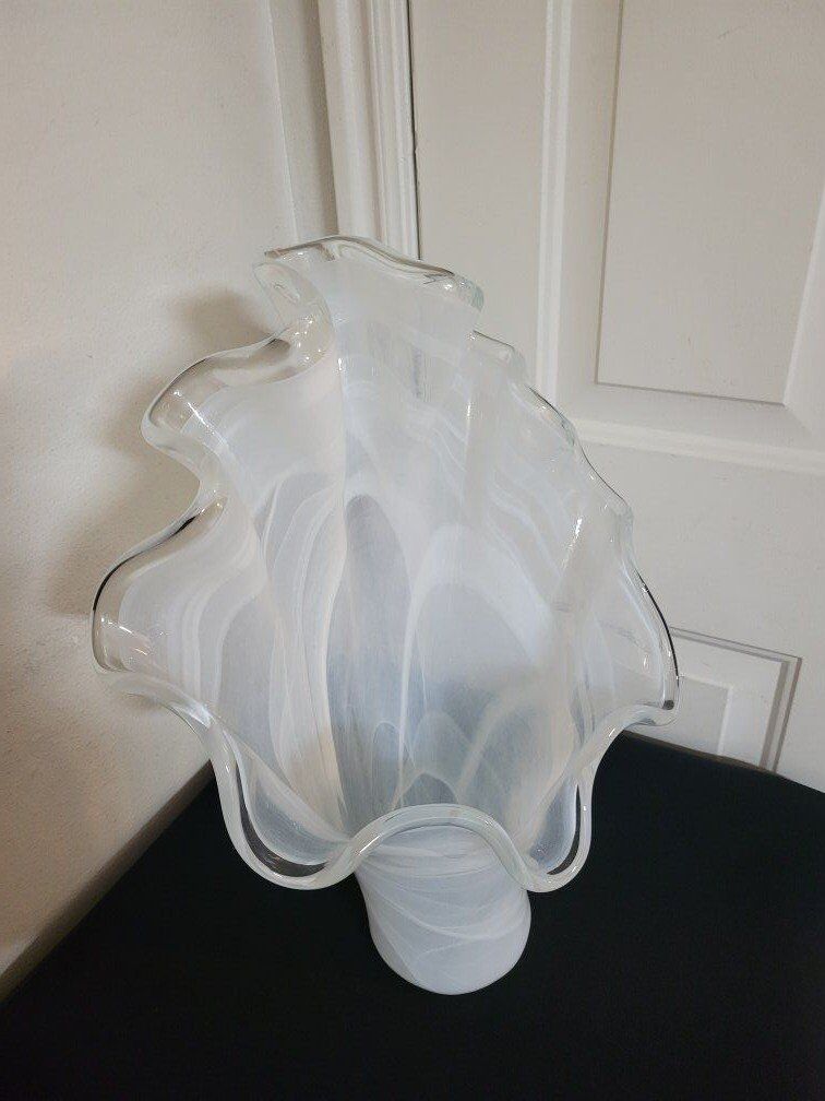 VenmoMurano Style Art Glass White Swirl Handkerchief Clam Shell Vase, Crystal Edge 18” Tall Vase, Novelty Art Glass Made in Italy, Hand Blown. inf 702 3558824