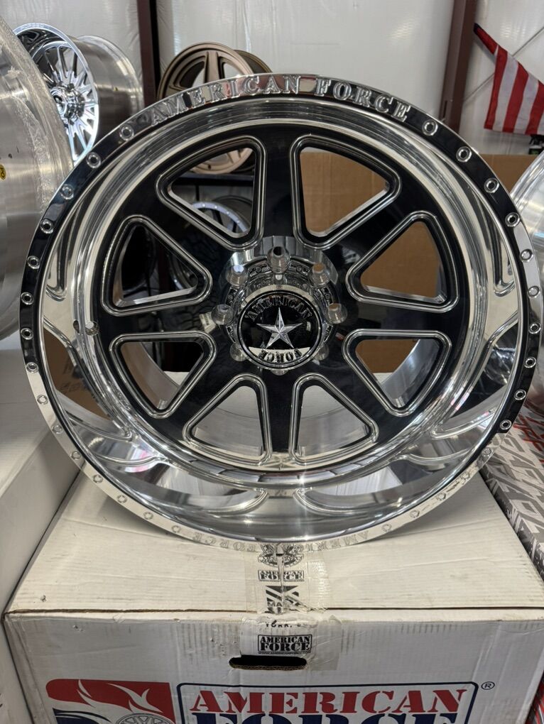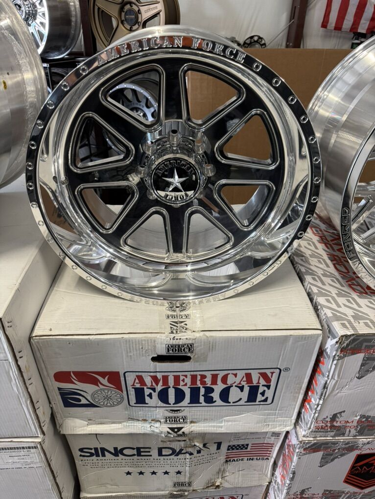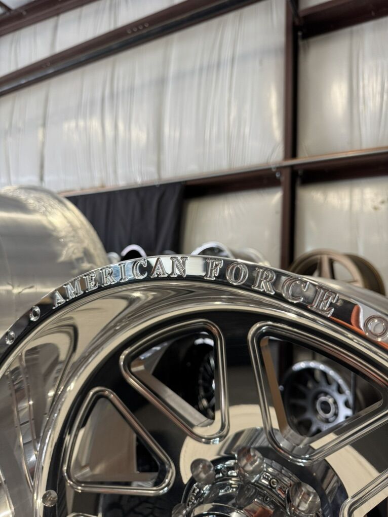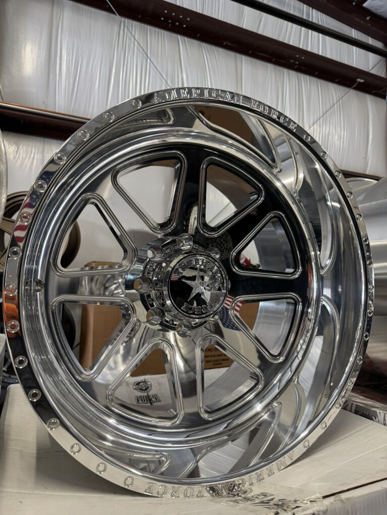 wheels are 22x12 American force “ridge” Billet forged aluminum wheels -55 offset, concave cut Mirror polished finish Billet