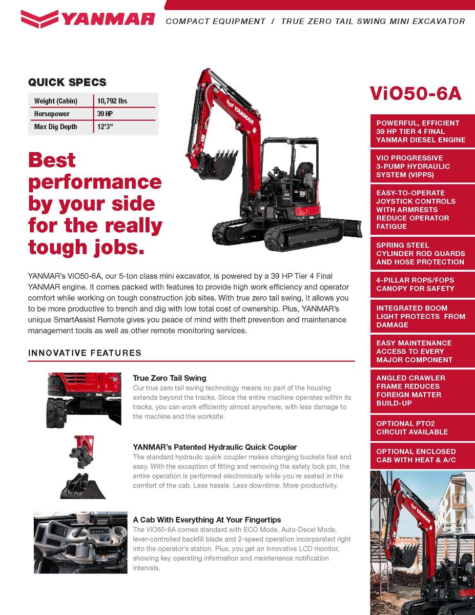 When you combine the best-in-class performance with true zero tail swing technology, you get the definitive performance of the Vi050-6A. This 5-ton mini excavator never shies away from work thanks to the hard-nosed performance of its 39HP Tier 4 Final Yanmar diesel engine. We then super-charged its capability with compact workspace capability of true zero tail swing, giving you the ability to dig, backfill and pack quickly in the tightest confines. The full-featured Vi050-6A features the standard performance and efficiency of ECO mode, auto deceleration, 78” backfill blade, and auto-shifting two-speed travel. Plus add even more capability with optional 4-way blade control, blade auto-float, and second auxiliary hydraulic circuit, and you’ll soon discover doing more for less is second nature for this mini excavator.