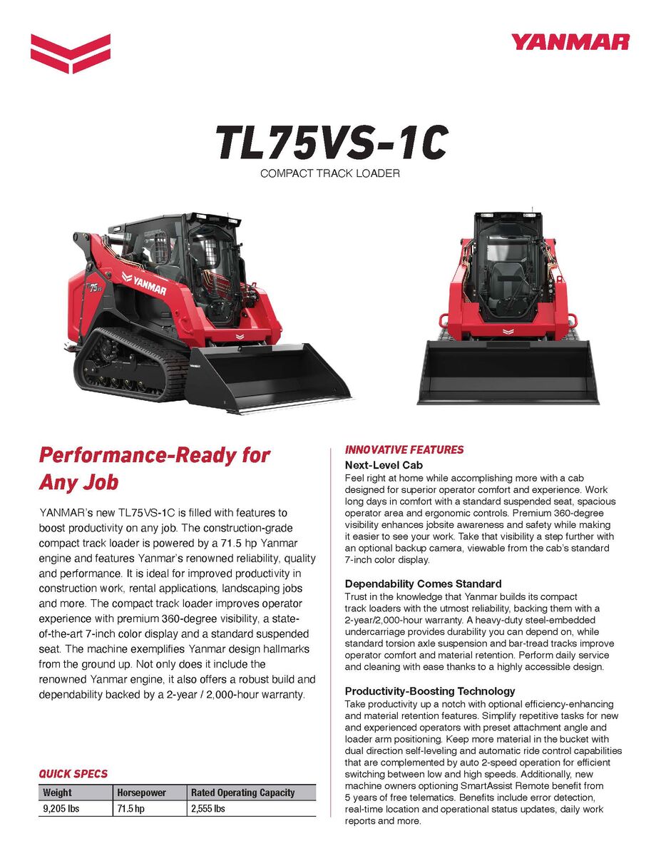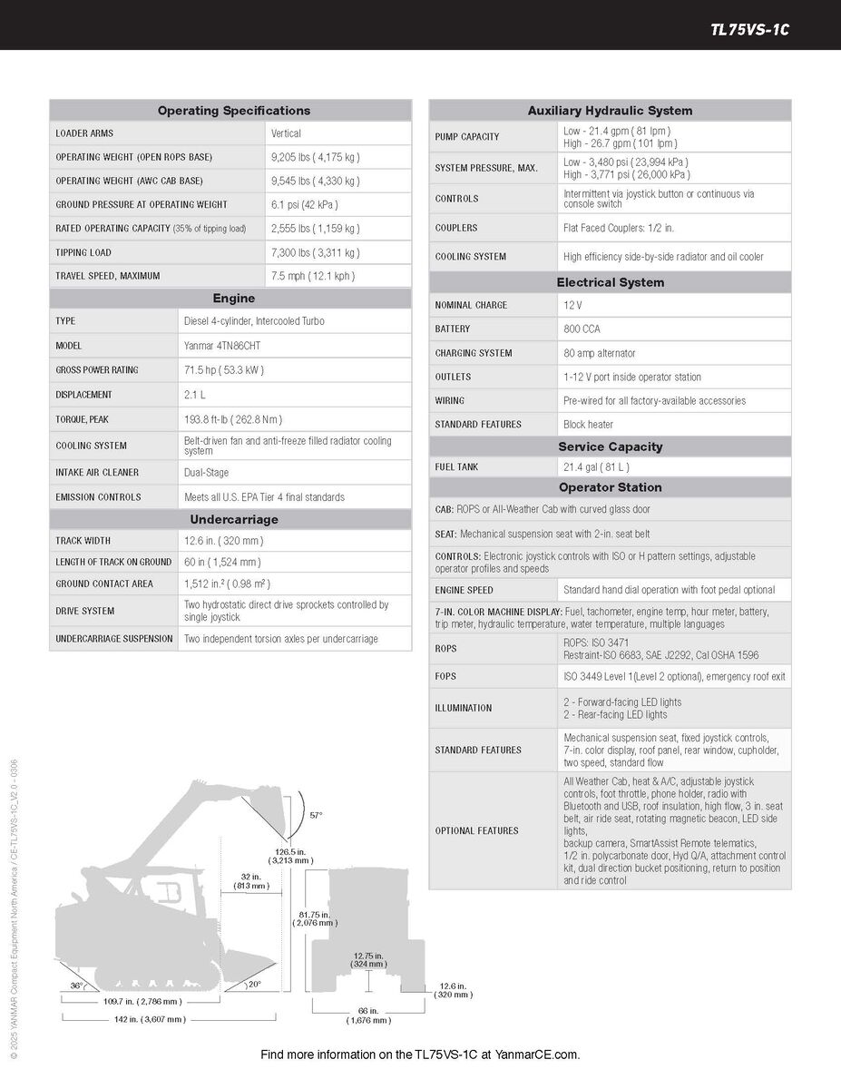 0% FOR 60 MONTH FINANCING AVAILBLE. 9,205 LBS WEIGHT, AND 71.5HP YANMAR ENGINE, HYDRAULIC SKID STEER QUICK ATTACH. 2555lbs ROC JAPANESE ENGINEERING AT ITS FINEST. BEST IN CLASS POWER WITH UNPARRELELD PRECISION. Introducing the TL75VS-1C, a versatile powerhouse dominating construction, utility, and rental sectors. With towering lift height, robust capacity, and Yanmar reliability, it’s the epitome of uncompromising performance. Powered by a 71.5-horsepower Yanmar Tier 4 Final diesel engine and 2,550-pound rated operating capacity, it excels in heavy-duty tasks with precision and efficiency. Backed by a 2-year/2,000 hour warranty, TL75VS-1C delivers unmatched cab comfort and cutting-edge technology all in one. From its hardy construction to the savvy SmartAssist telematics, this machine is a force to be reckoned with, blending relentless performance with intuitive ease of use. It’s not just a tool; it’s your strategic partner in conquering the toughest jobs with unparalleled precision and grit. Purchase through Circle B Irrigation in Hyde Park, UT. Circle B Irrigation offers in-house service with factory trained technicians and a stocked parts department and 10+ Years of experience working with Yanmar. Cash price shown with $7,000 Cash Rebate Applied 0% financing price before tax $84,919 ($1,383/Month) All pricing does not include tax (7.25% in Hyde Park) Units includes a bucket, Cab with AC/Heat with HIGH FLOW hydraulics installed. Rubber Tracked units.