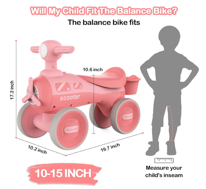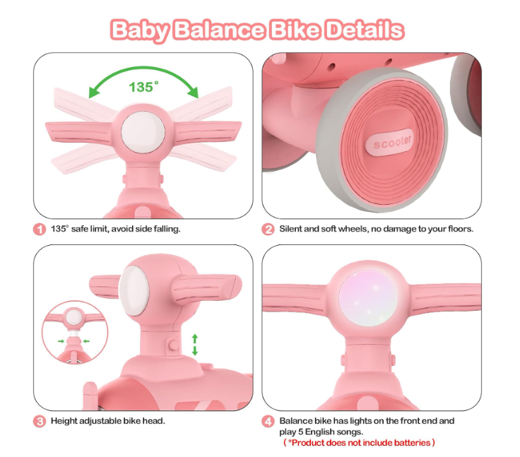 Colorful Lighting & Music Design: In order to increase the children's fun, we added colorful lights and play music function in the front part of the balance bike, and you can switch to different English songs through the buttons. Please note: This toddler balance bike does not include batteries, you need to prepare three AA batteries.