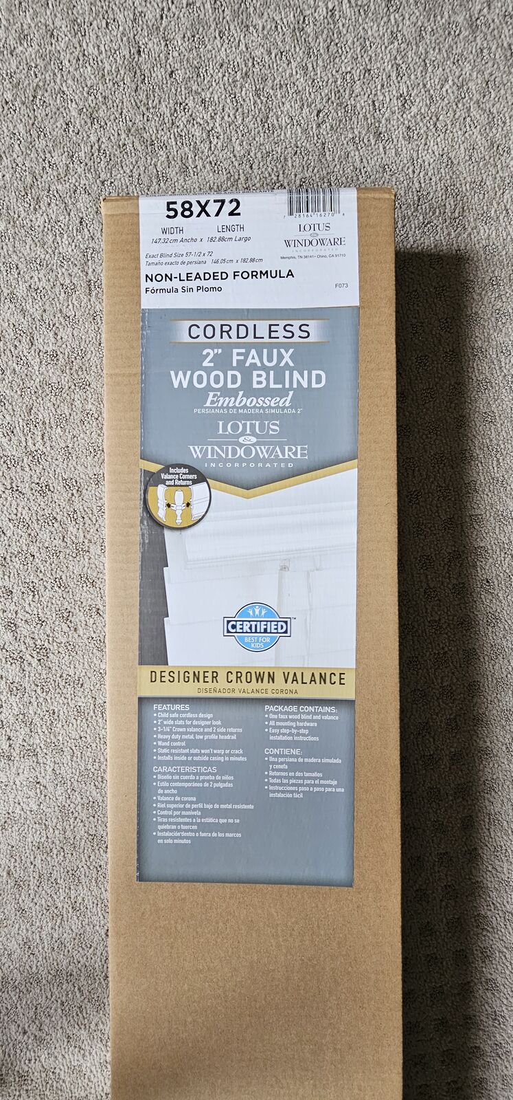 VenmoLotus & Windoware Cordless, 2 Inch Faux Wood Blind, 58" Wide x 72" Long, Window Blinds, Blinds & Shades, Blinds for Indoor Windows, Embossed, Bright White. Located in Saratoga Springs. We accept cash or venmo.