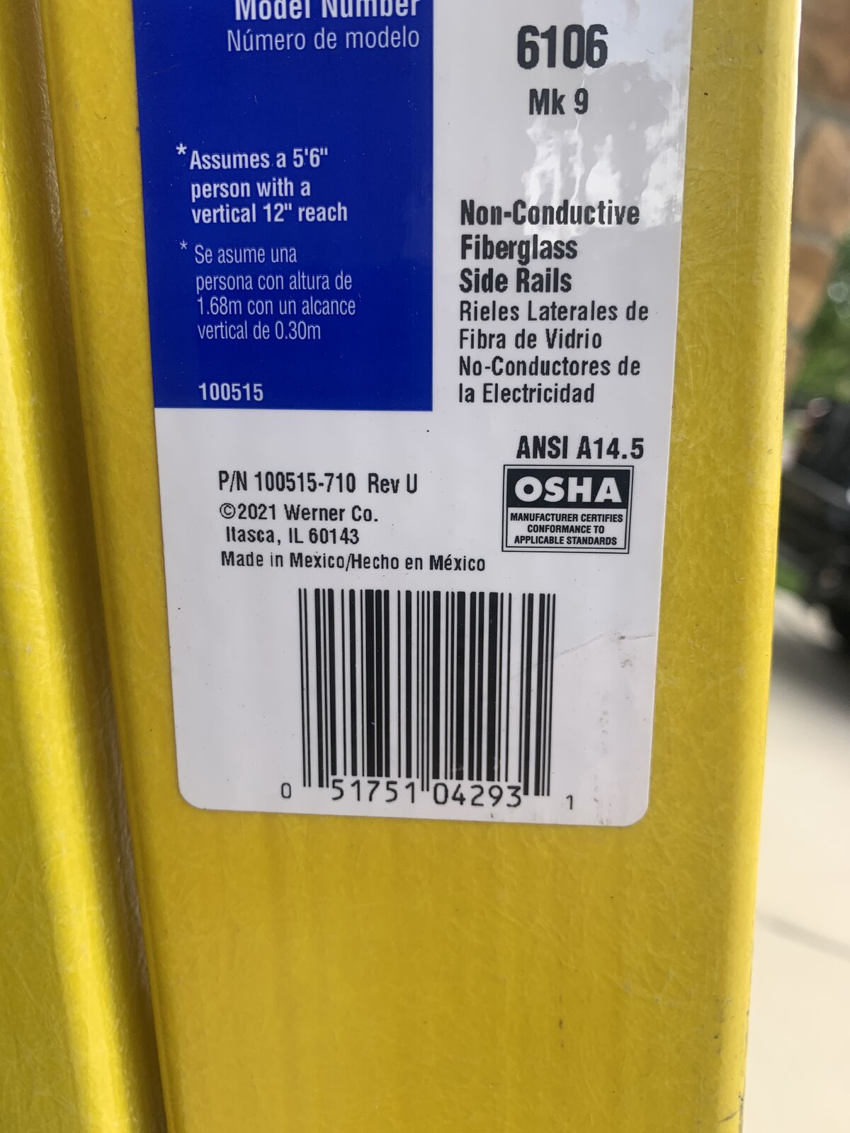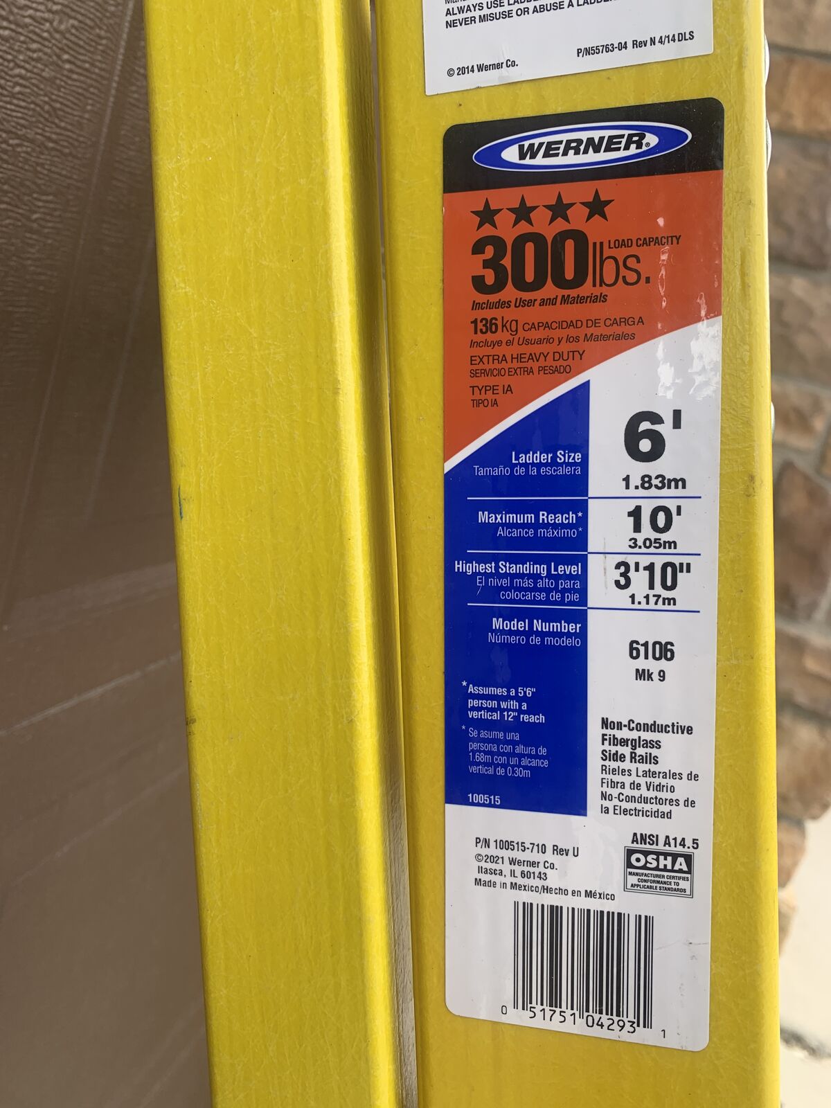 Stepladder, Material Fiberglass, ANSI Type IA, Ladder Height 6 ft, Load Capacity 300 lb, Number of Steps 5, Base Spread 41.1 in, Bottom Width 22 in, Step Depth 3 in, Step Tread Ribbed, Series 6100, Includes Top with Drill Holster and Slots for Lock-In Accessories, Standards ANSI A14.5-2007, OSHA Compliant, Rung/Step Spacing 12 in